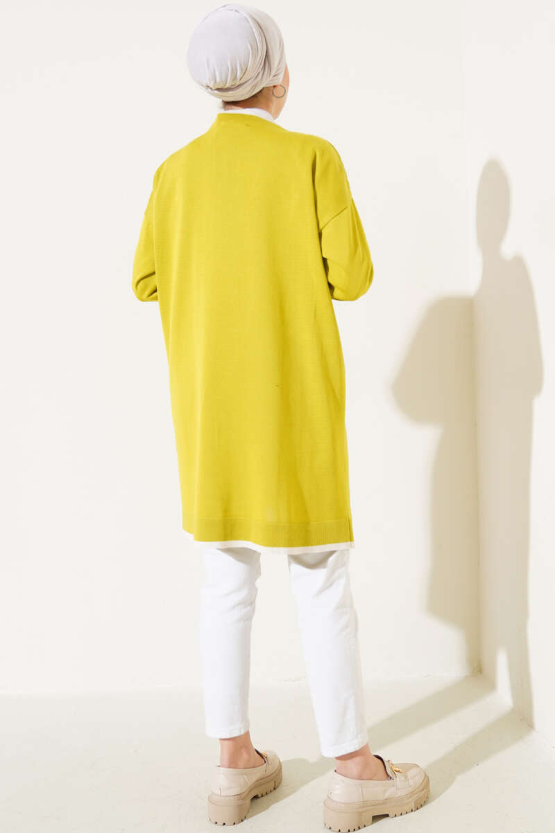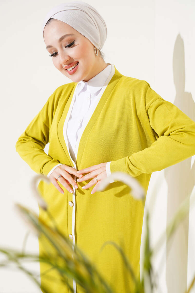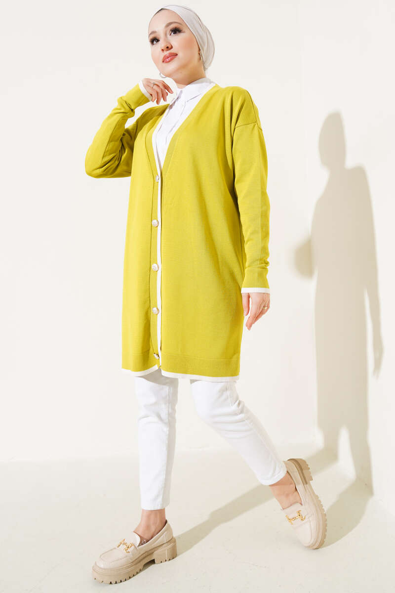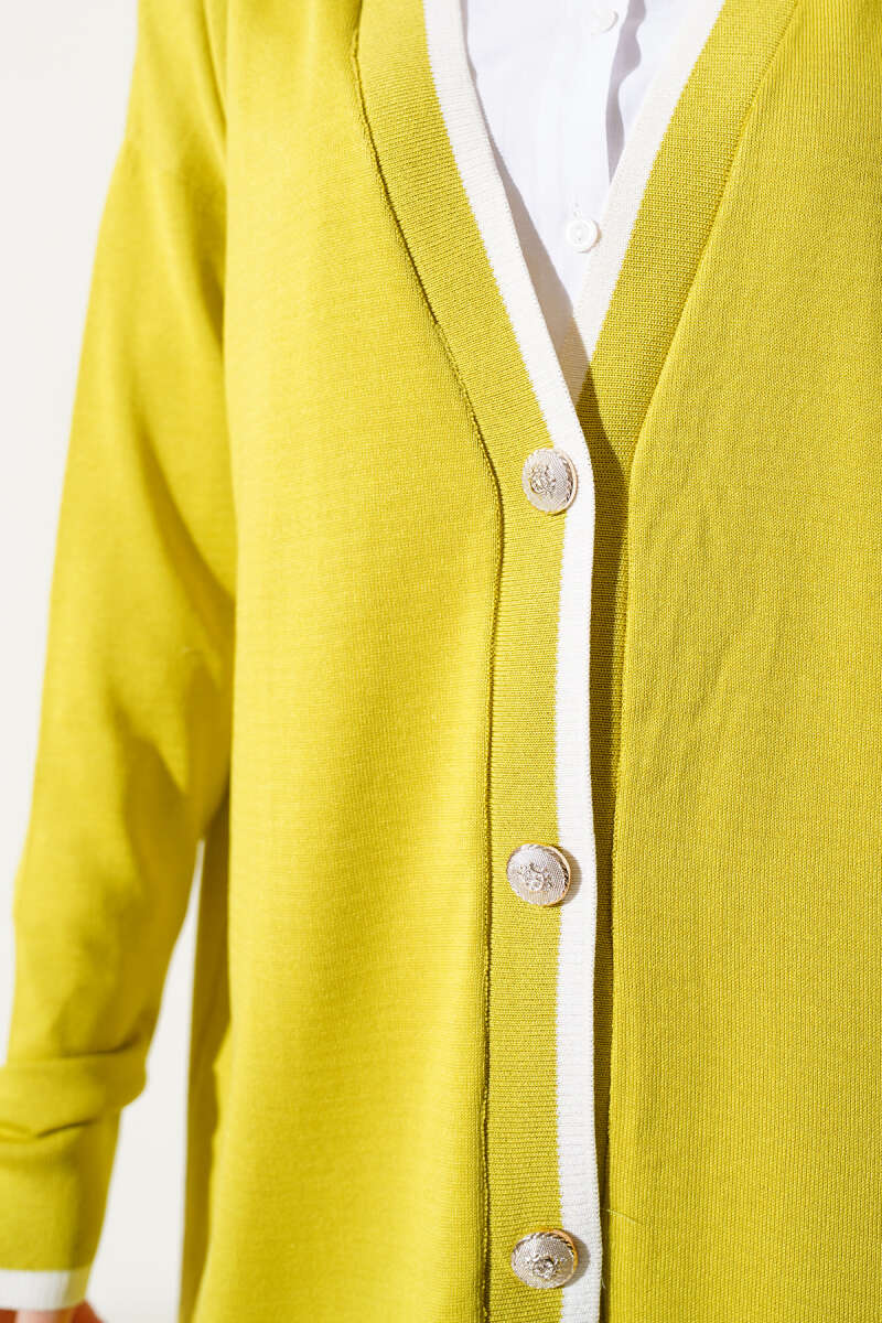 Düğmeli Şerit Detaylı Triko Hırka Yağ Yeşili