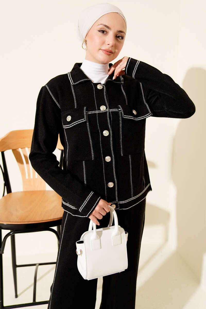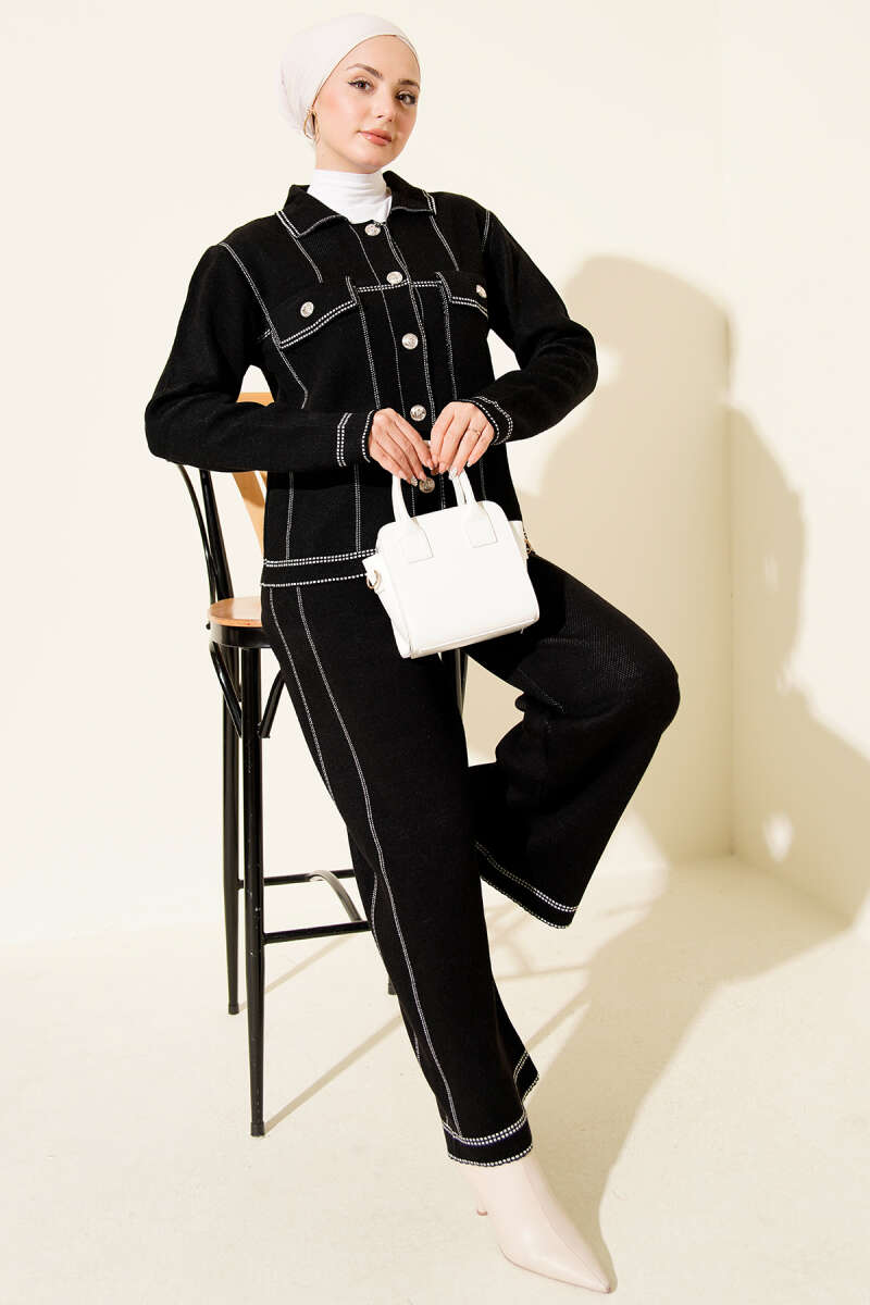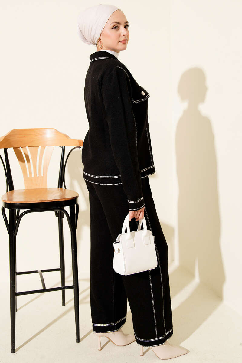 Kruvaze Yelekli İkili Triko Takım Siyah