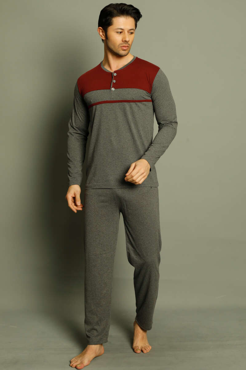 Düğmeli Şeritli Erkek Pijama Takımı Füme
