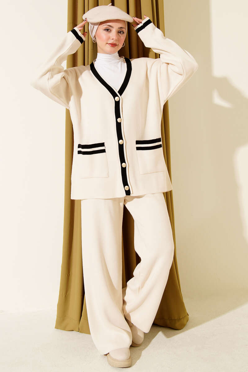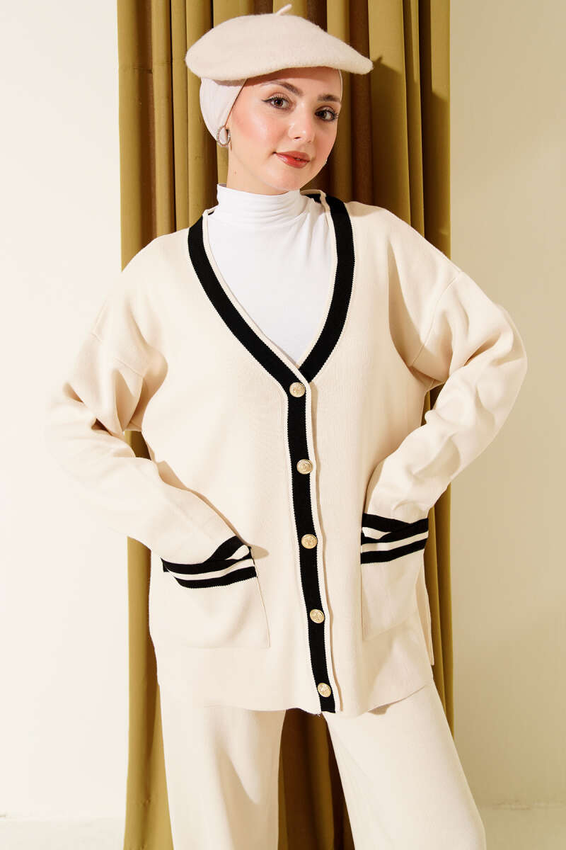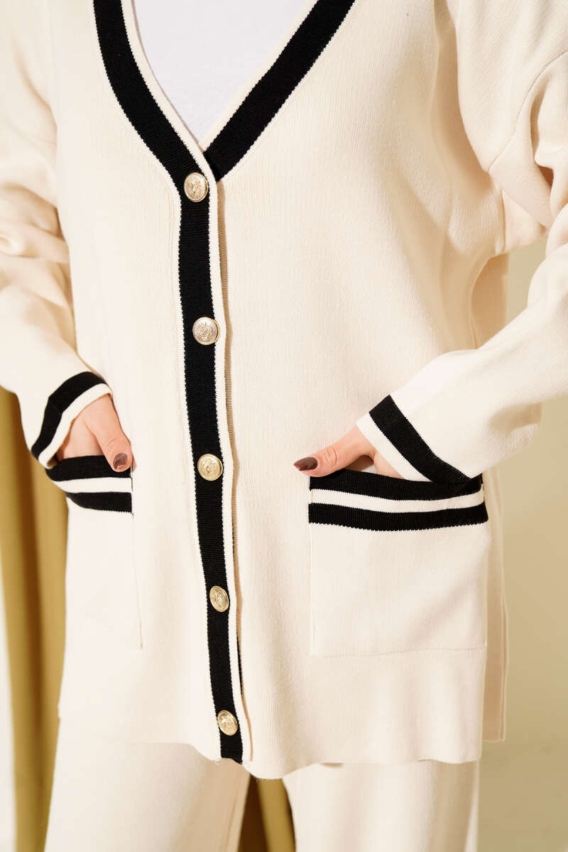 Düğmeli Şeritli Hırkalı Triko İkili Takım Siyah