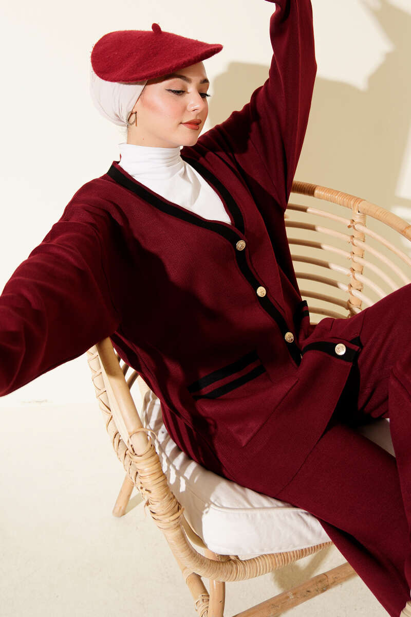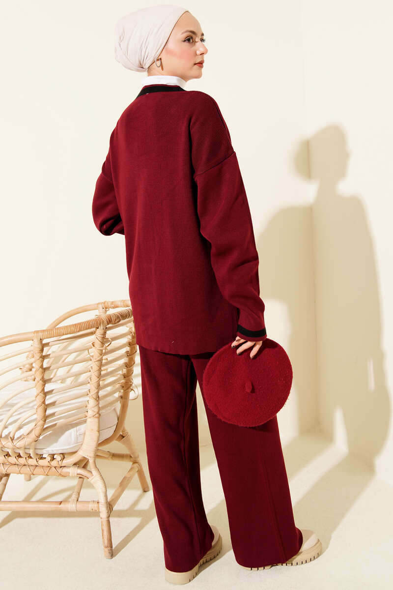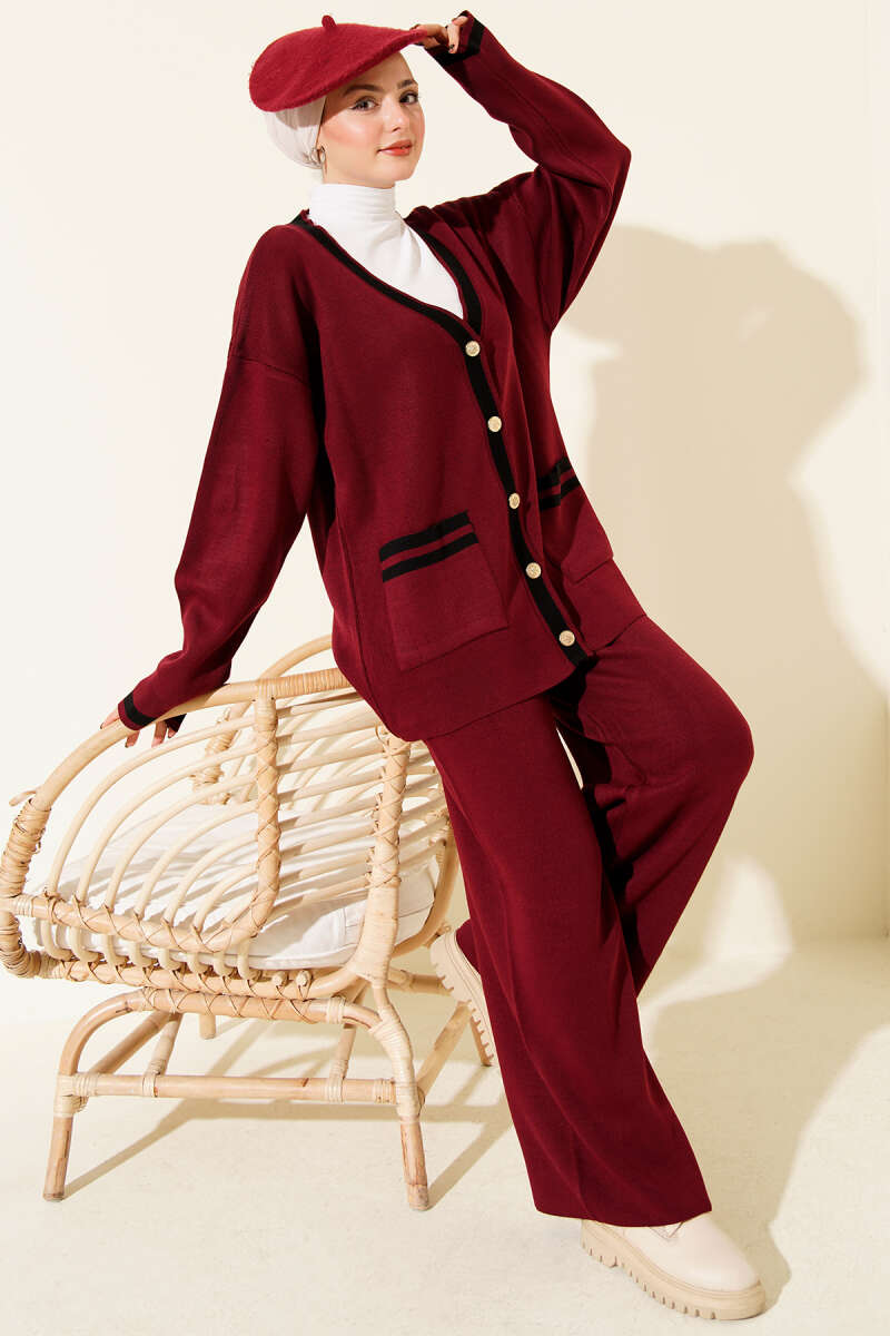 Atkı Detaylı Çizgili Triko İkili Takım Bordo