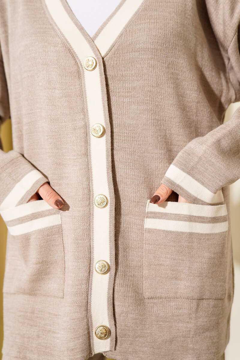 Kruvaze Yelekli İkili Triko Takım Pudra