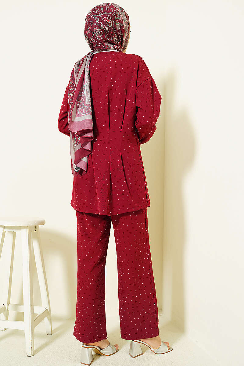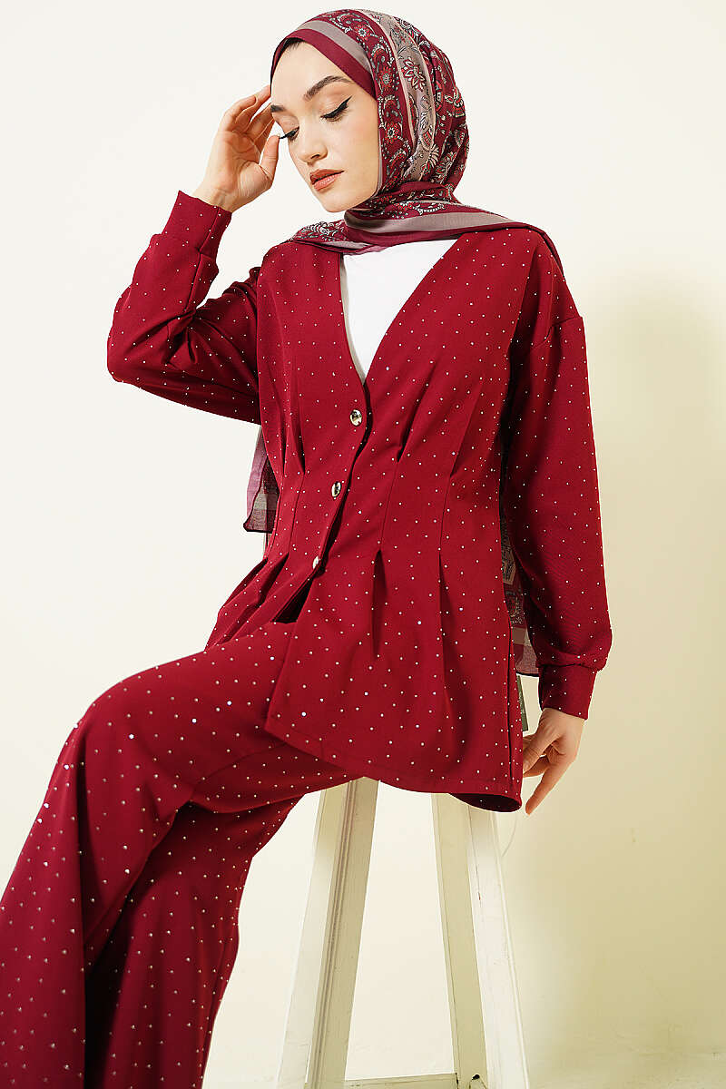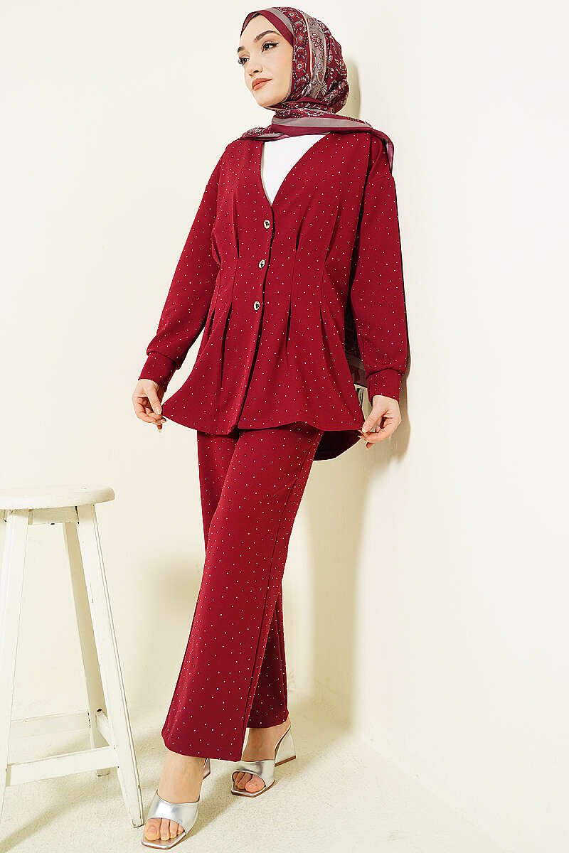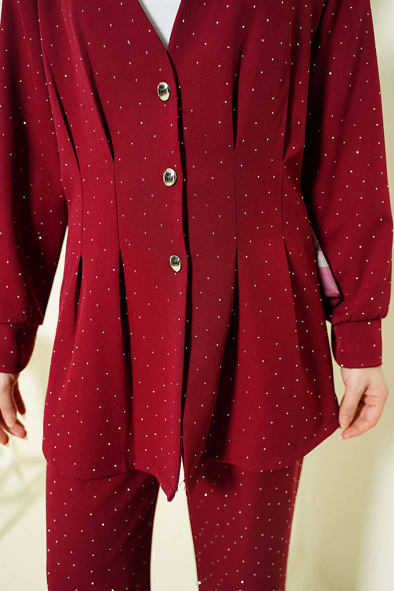 Düğmeli Taş Süslemeli İkili Takım Bordo