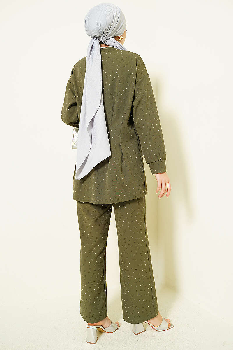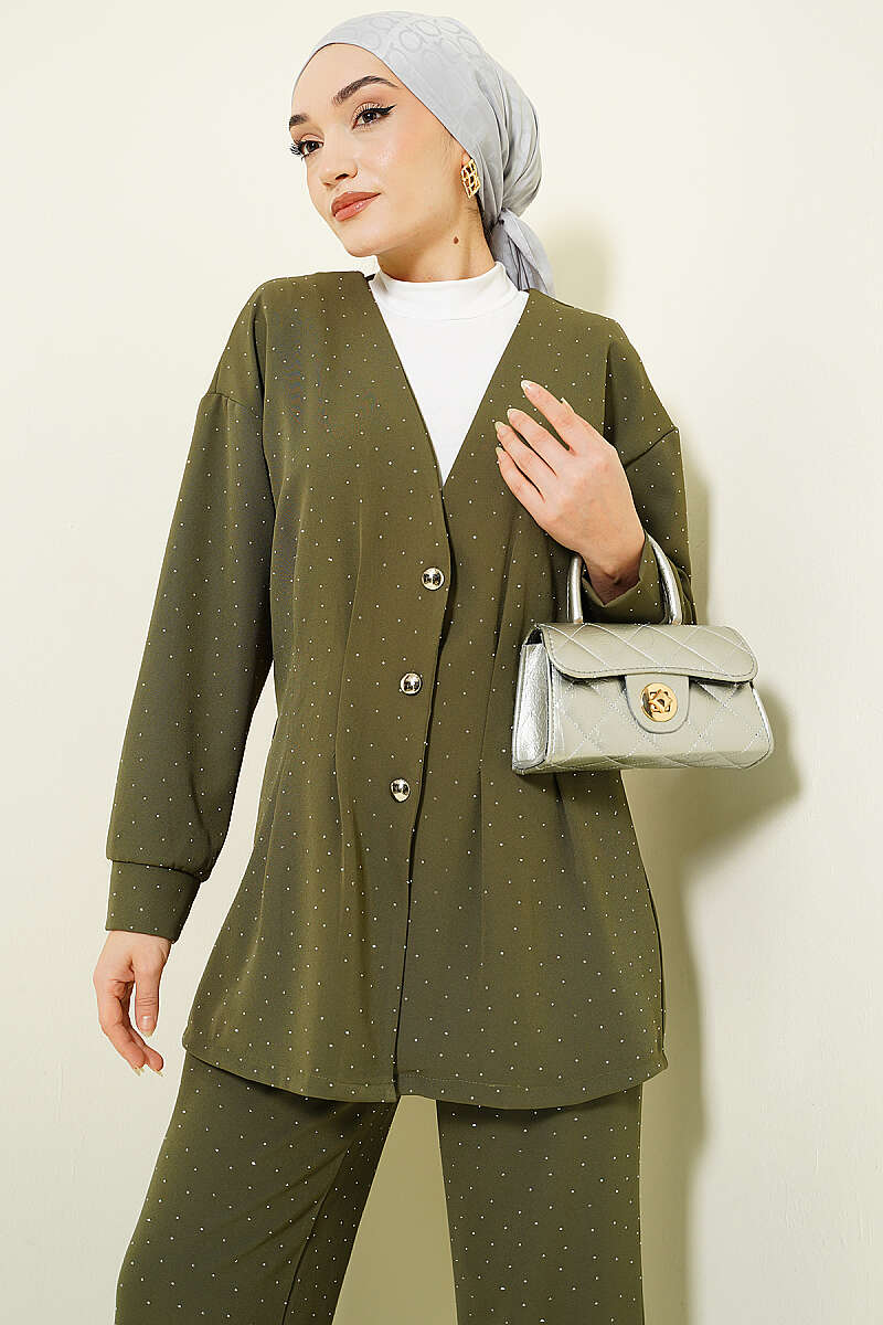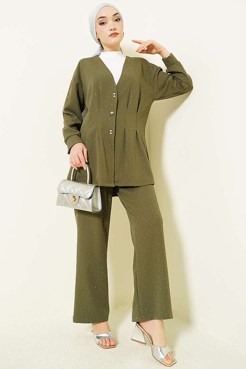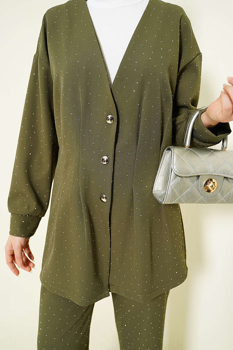 Düğmeli Taş Süslemeli İkili Takım Haki
