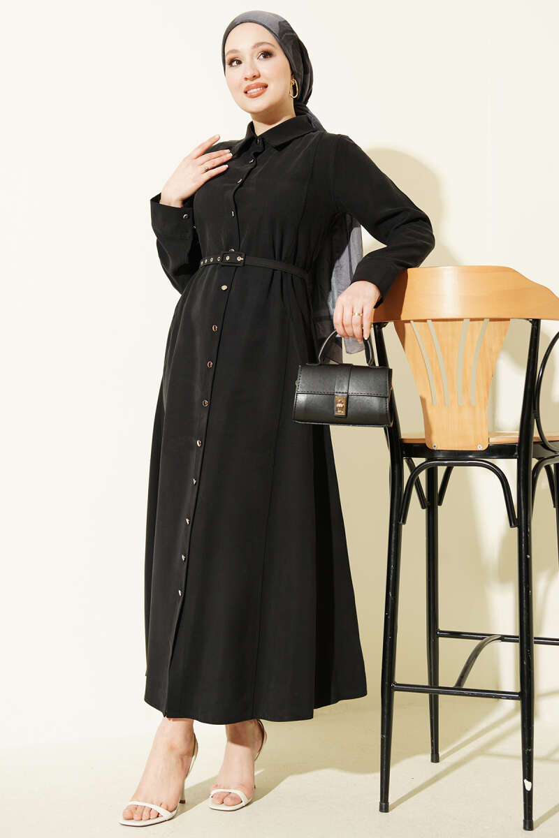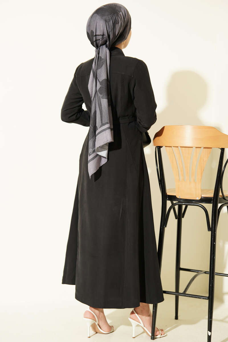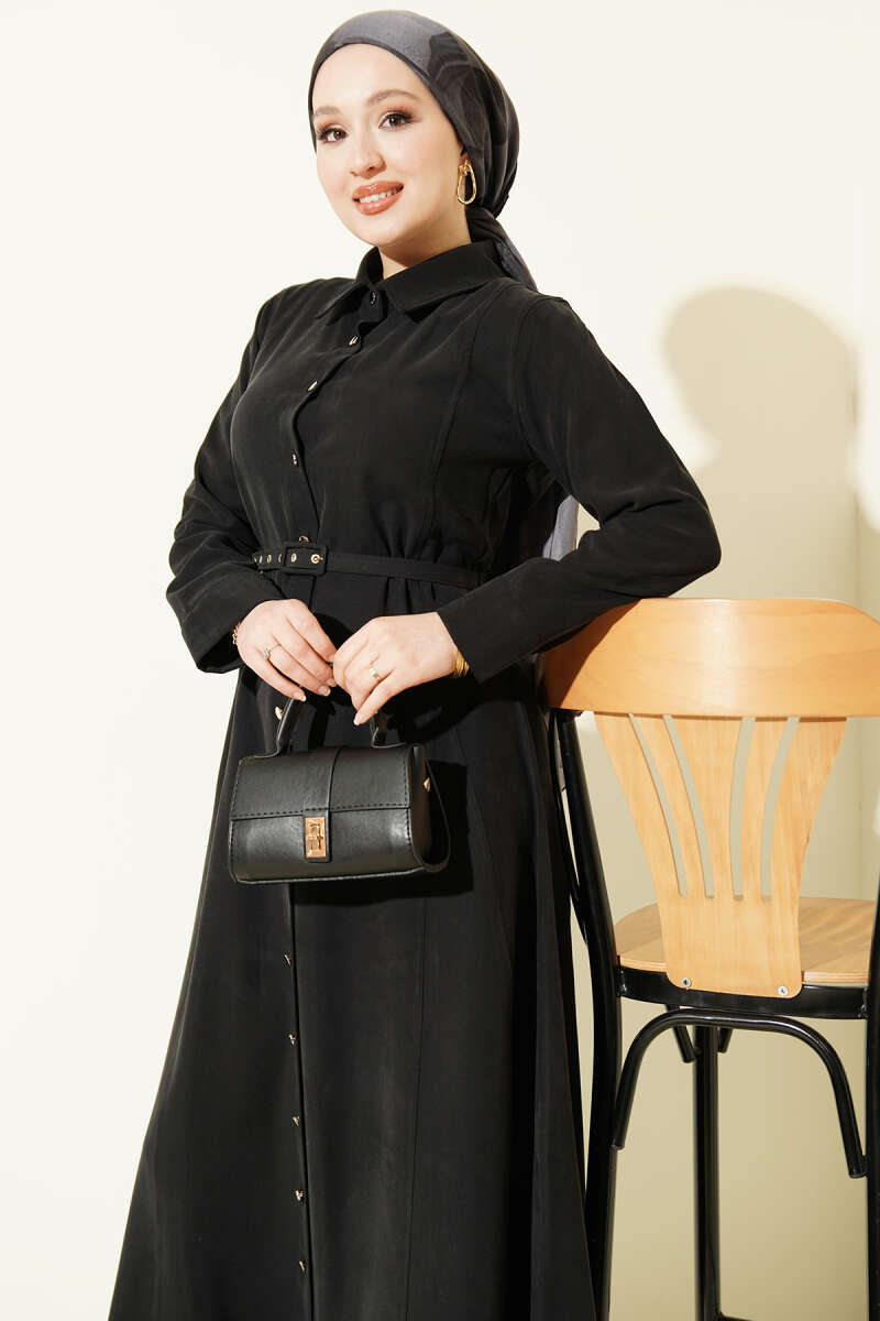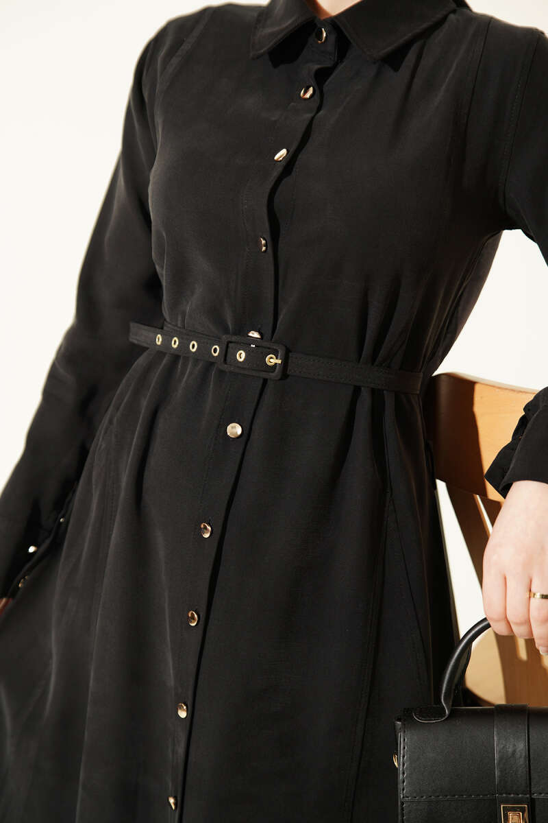 Hakim Yaka Pensli Kemerli Elbise Siyah