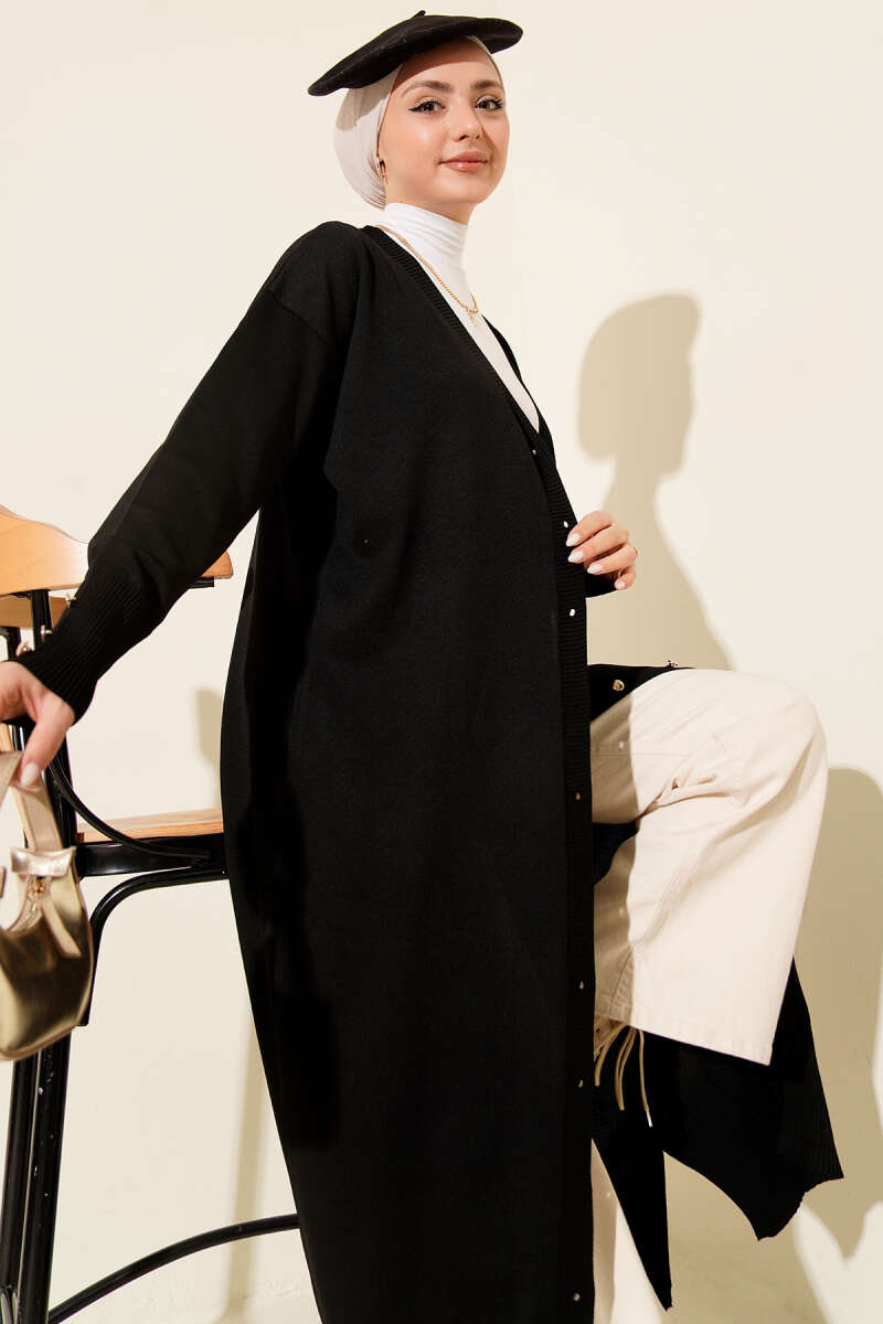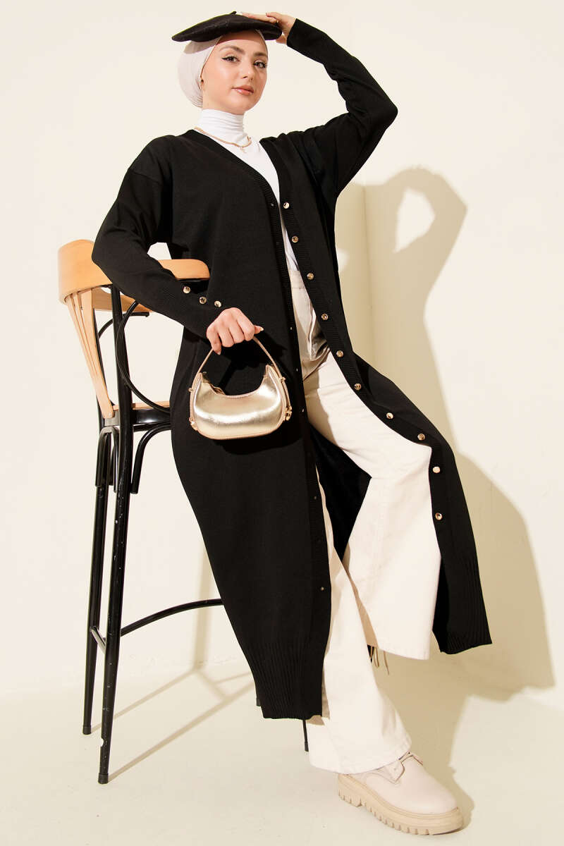 Gold Düğmeli Basic Sakallı Triko Hırka Siyah