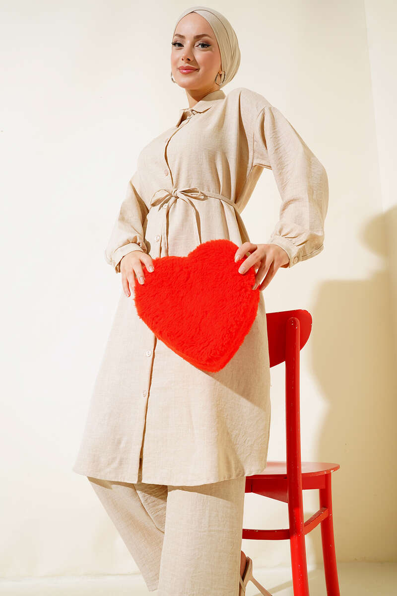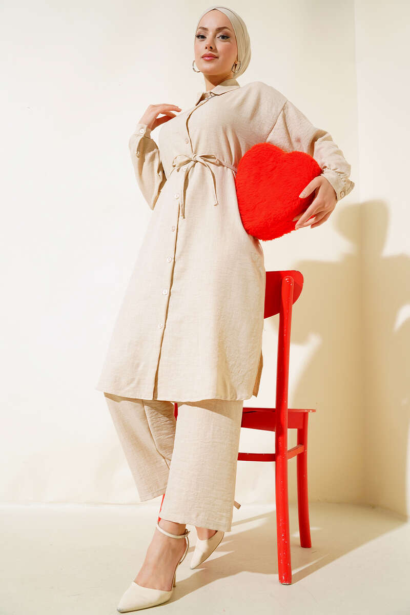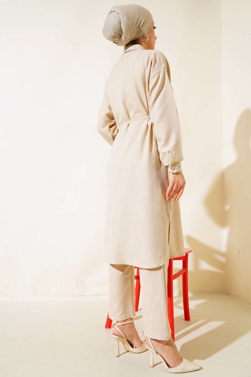 Düğmeli Uzun Tunikli Keten İkili Takım Bej