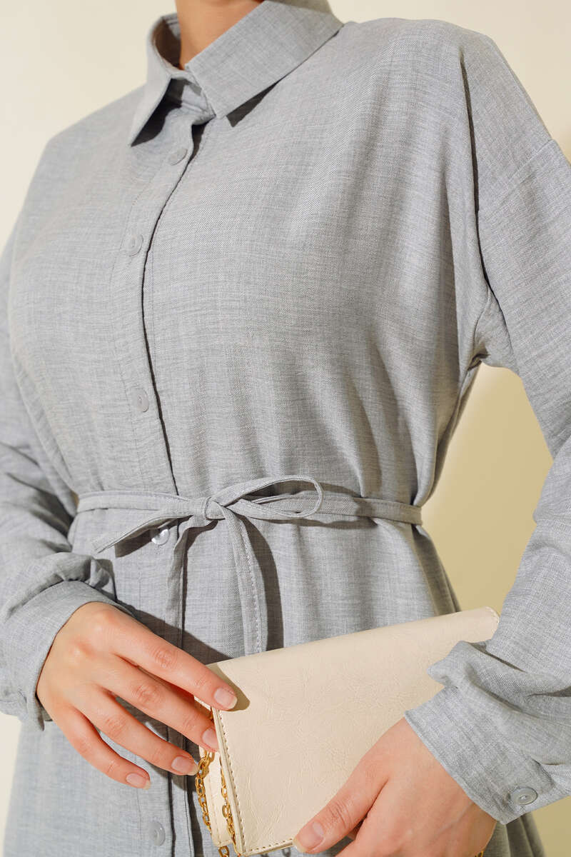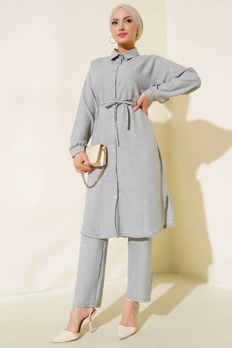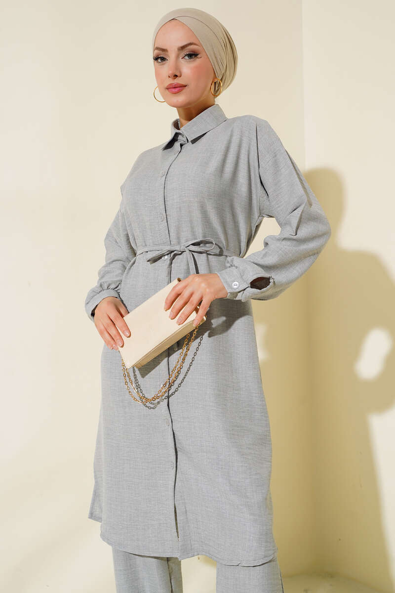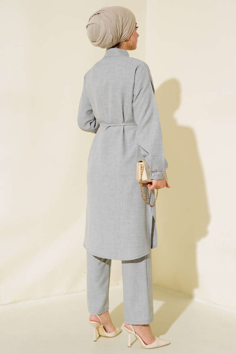 Düğmeli Uzun Tunikli Keten İkili Takım Gri