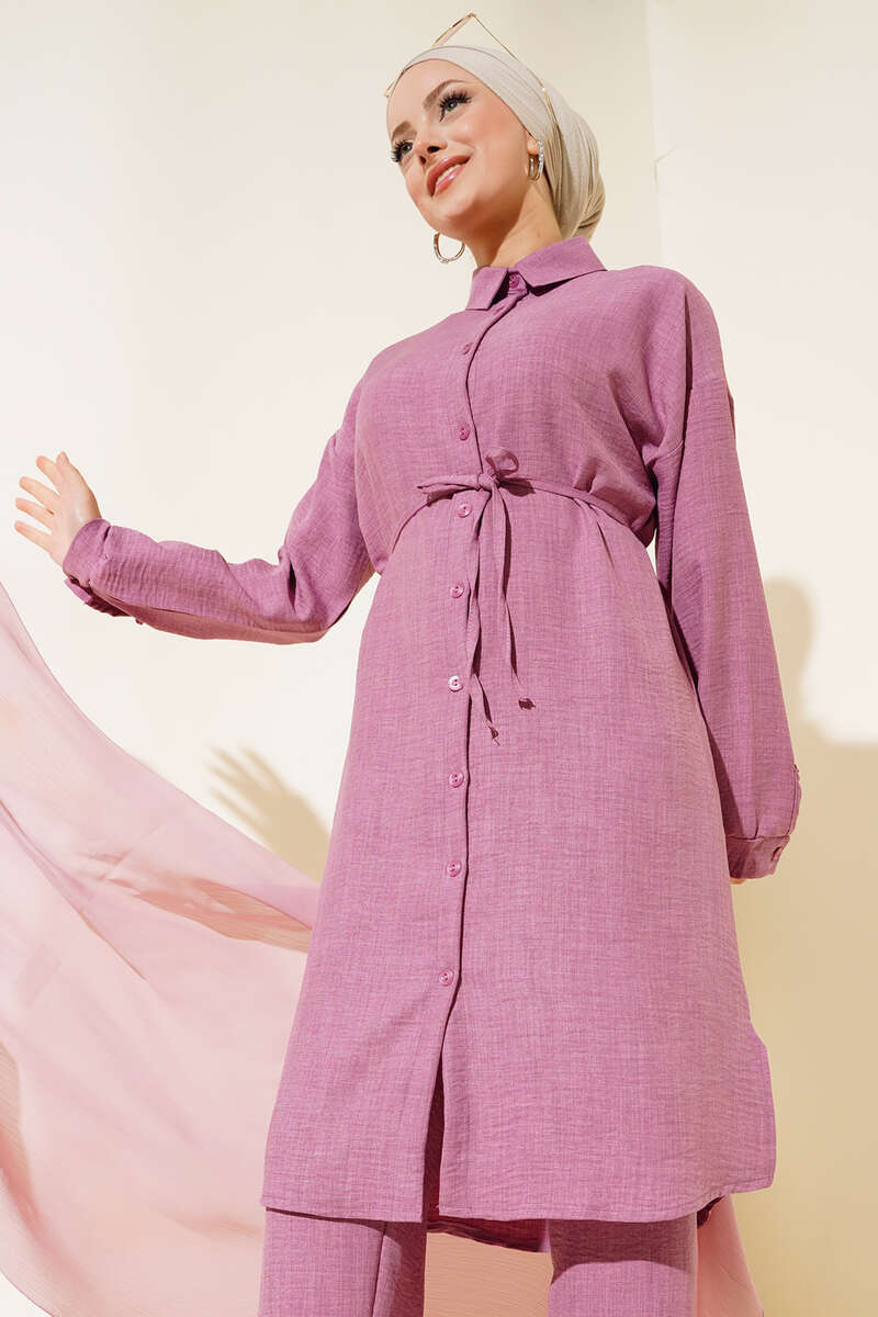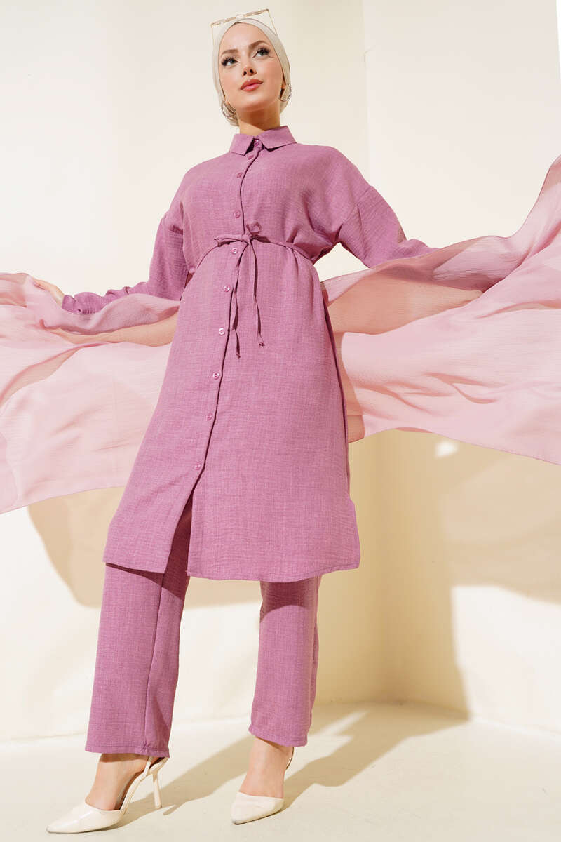 Düğmeli Uzun Tunikli Keten İkili Takım Gül Kurusu