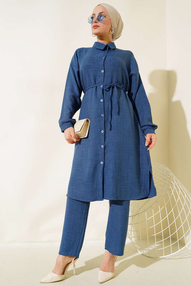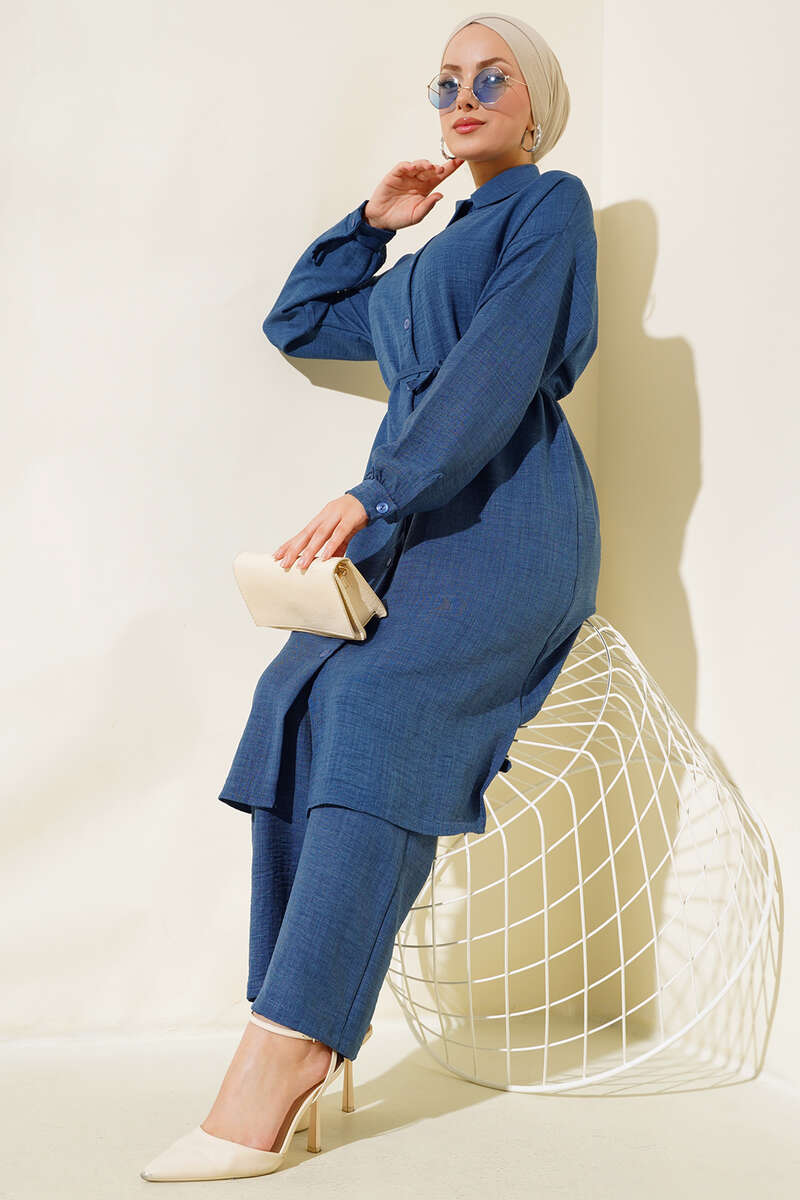 Düğmeli Uzun Tunikli Keten İkili Takım İndigo