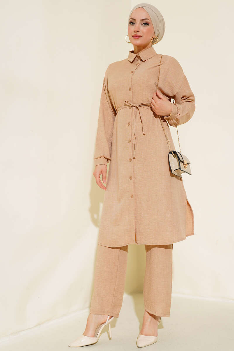 Düğmeli Uzun Tunikli Keten İkili Takım Latte
