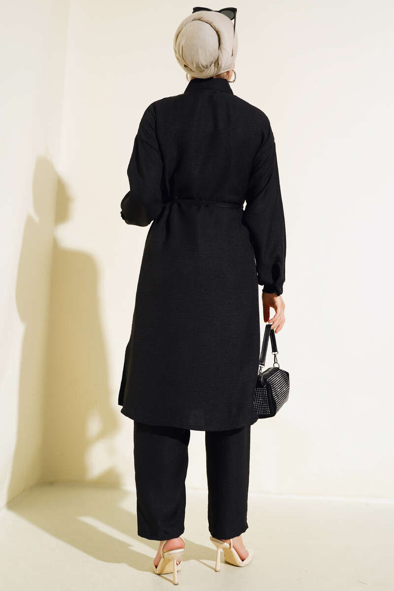 Düğmeli Uzun Tunikli Keten İkili Takım Siyah