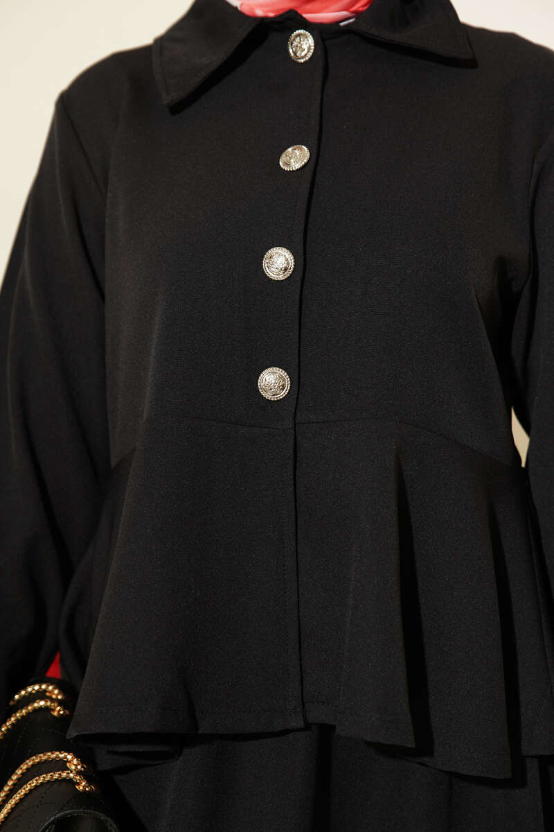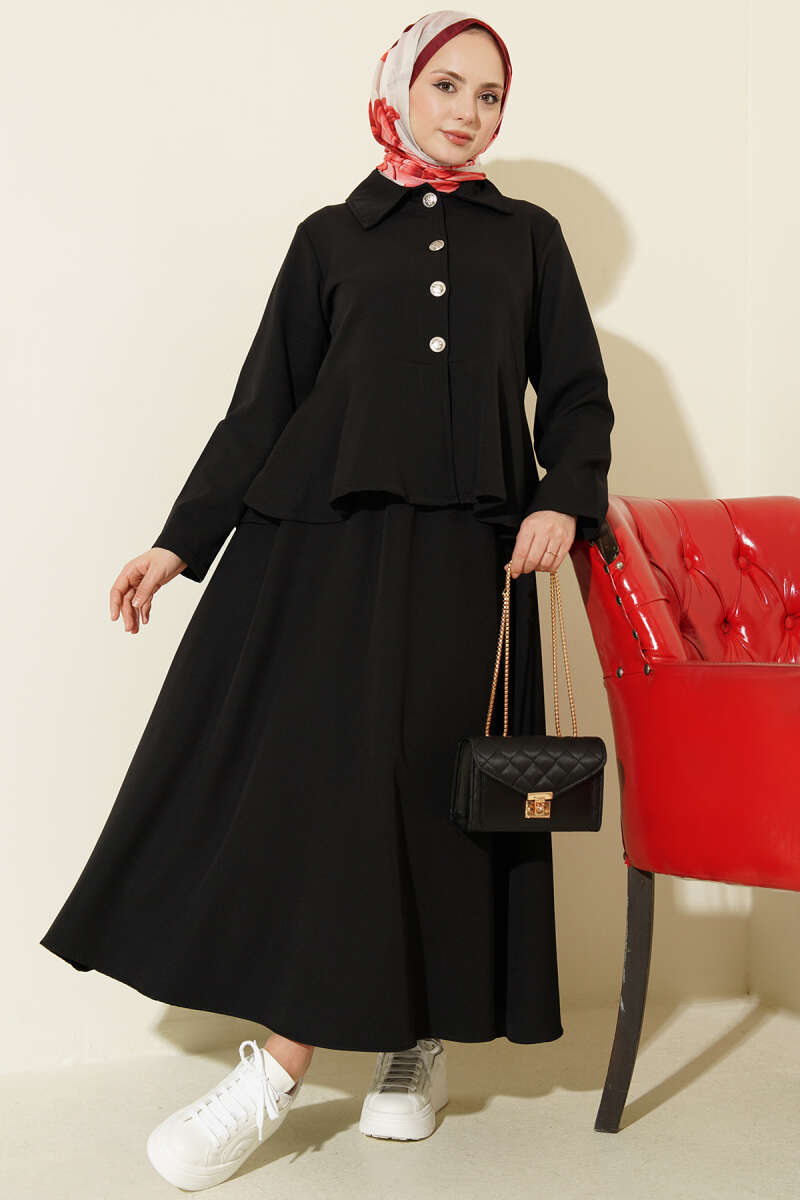 Düğmeli Volan Bluzlu Etekli İkili Takım Siyah