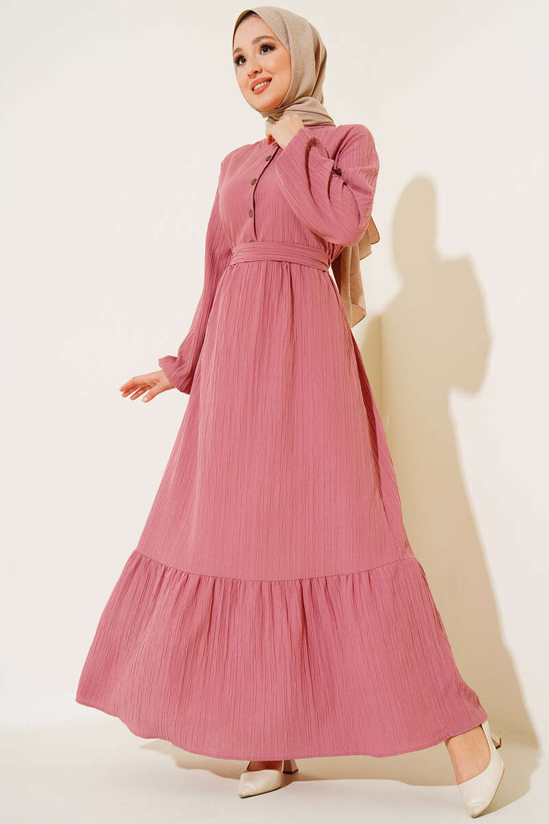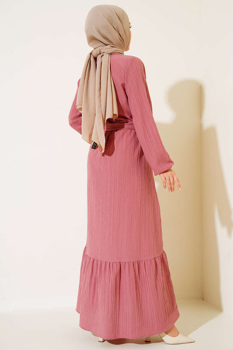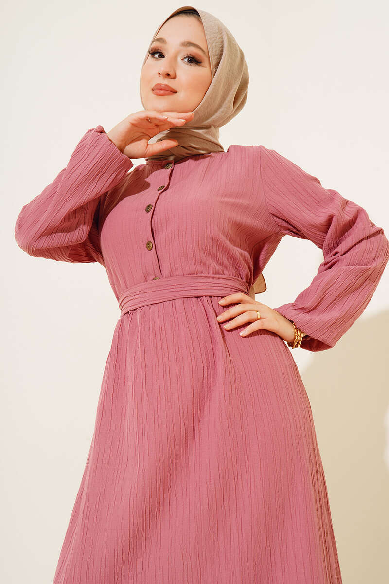 Düğmeli Yarı Patlı Kuşaklı Elbise Gül Kurusu