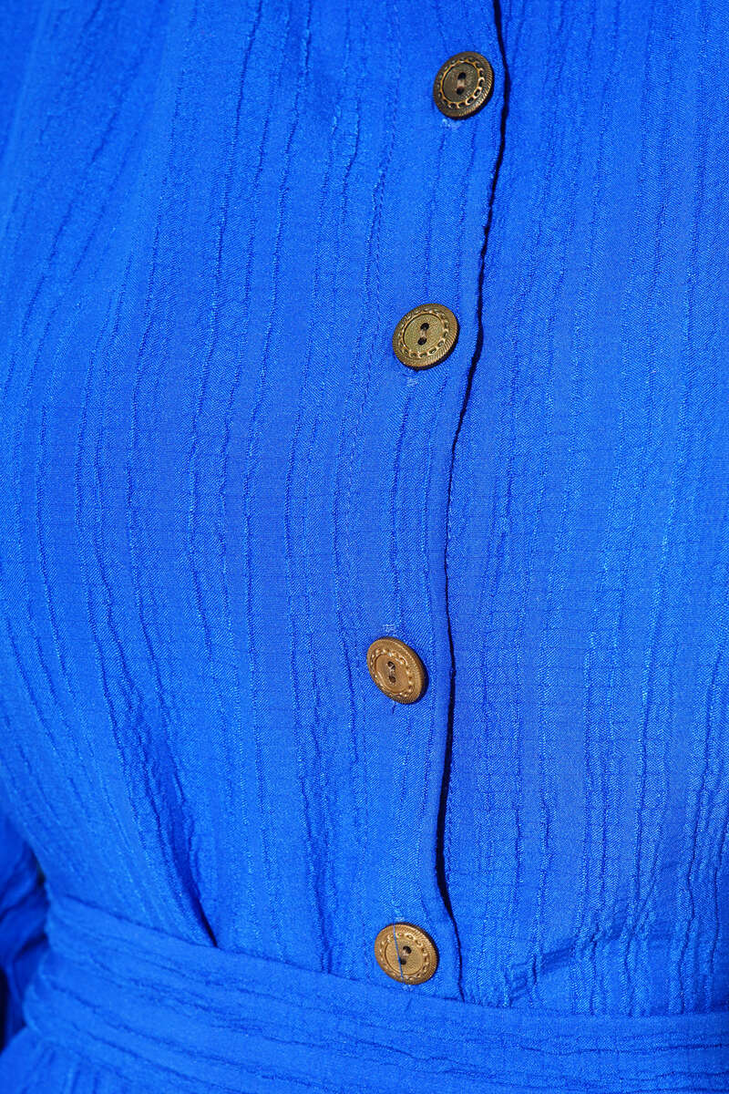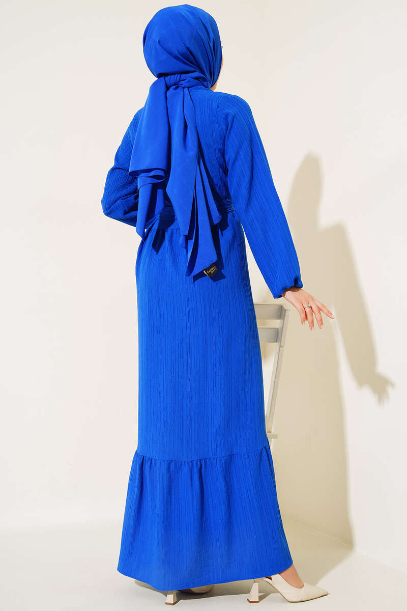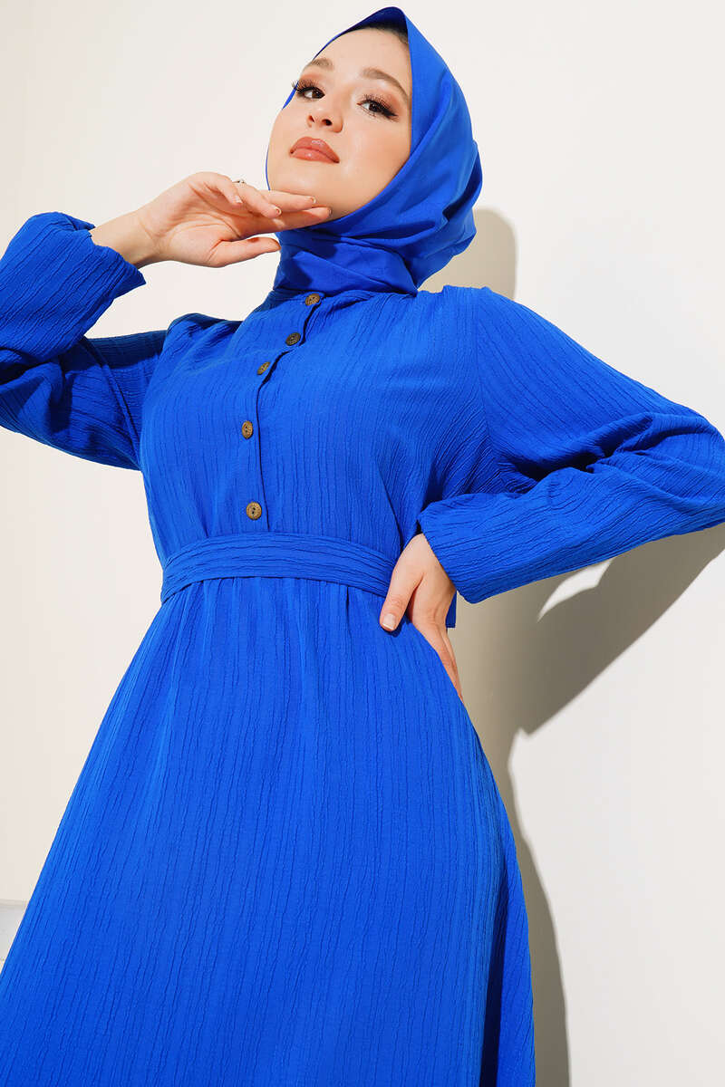 Yeni sezon elbisemiz tarzını yansıtmak isteyenler ilk tercihi olacaktır. Yarı patlı elbsemizin bilekleri lastiklidir. Kuşaklı olan elbisemizin kuşağı kendi kumaş ve rengindedir. İki adet kemer köprüsü bulunmaktadır.