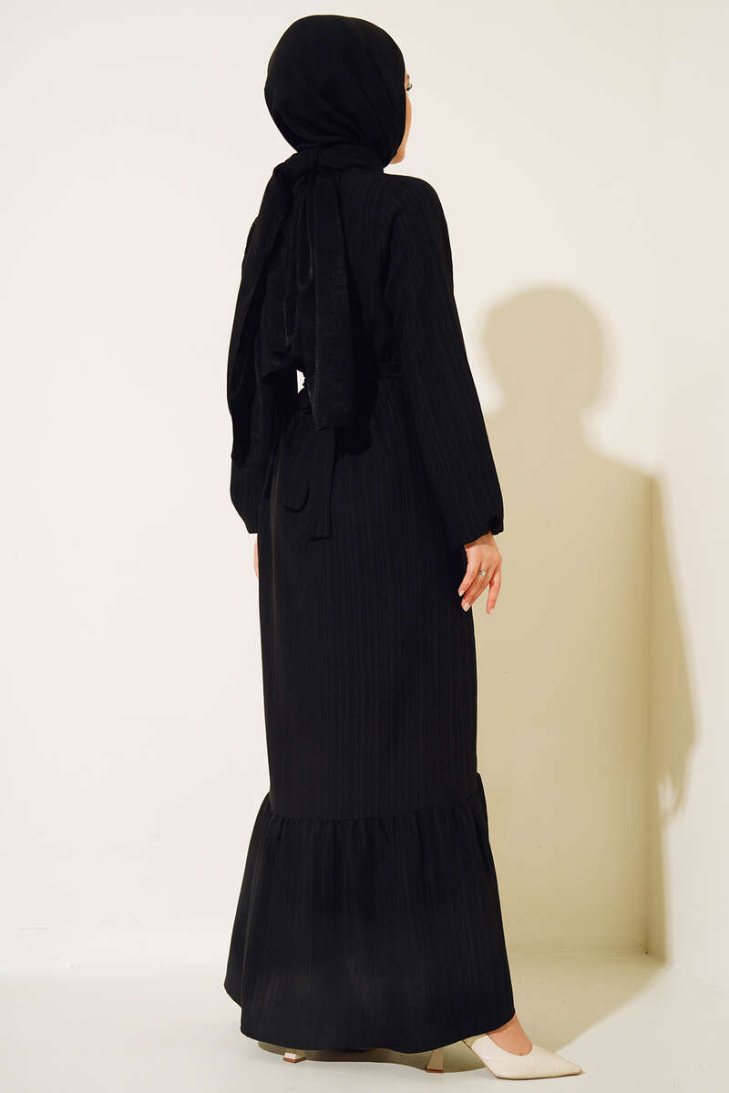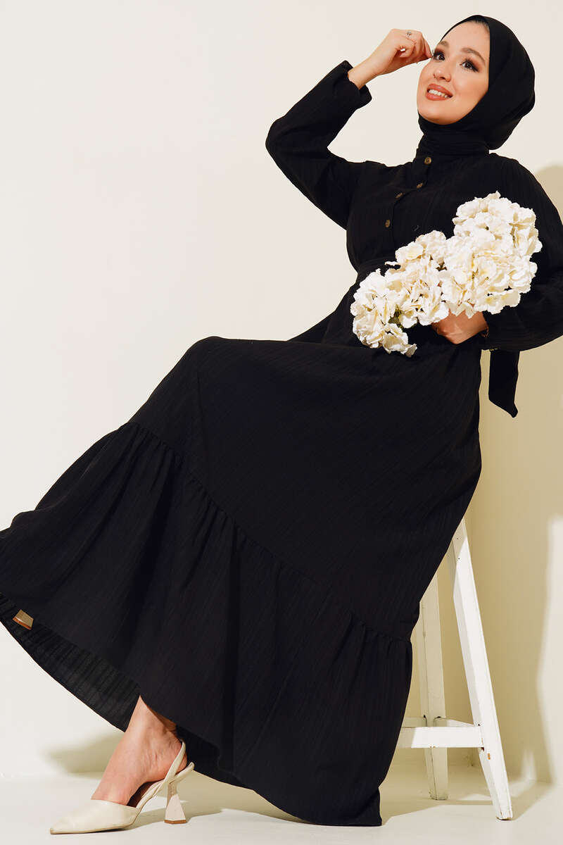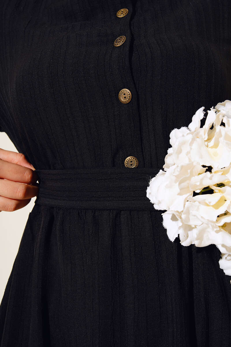 Düğmeli Yarı Patlı Kuşaklı Elbise Siyah