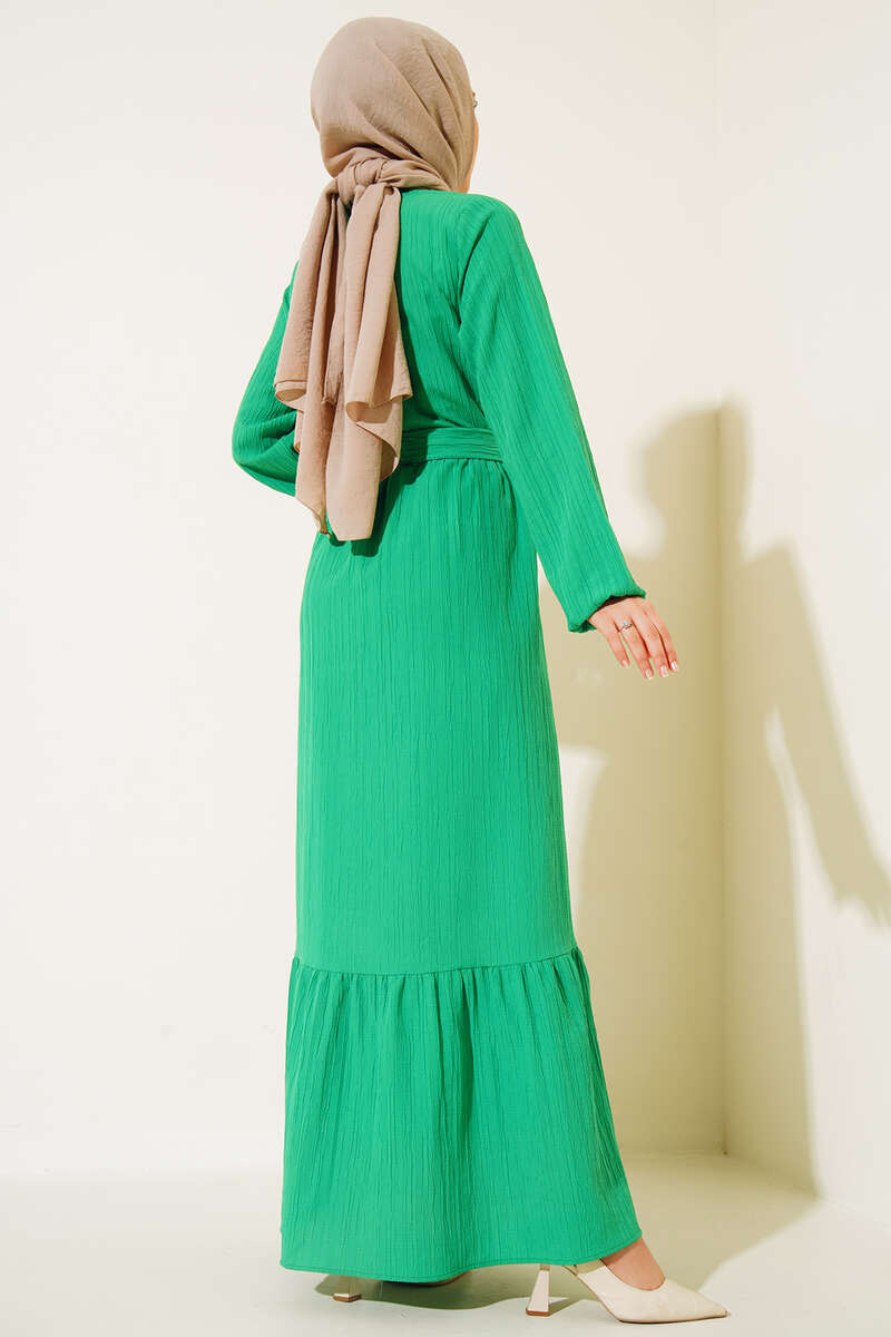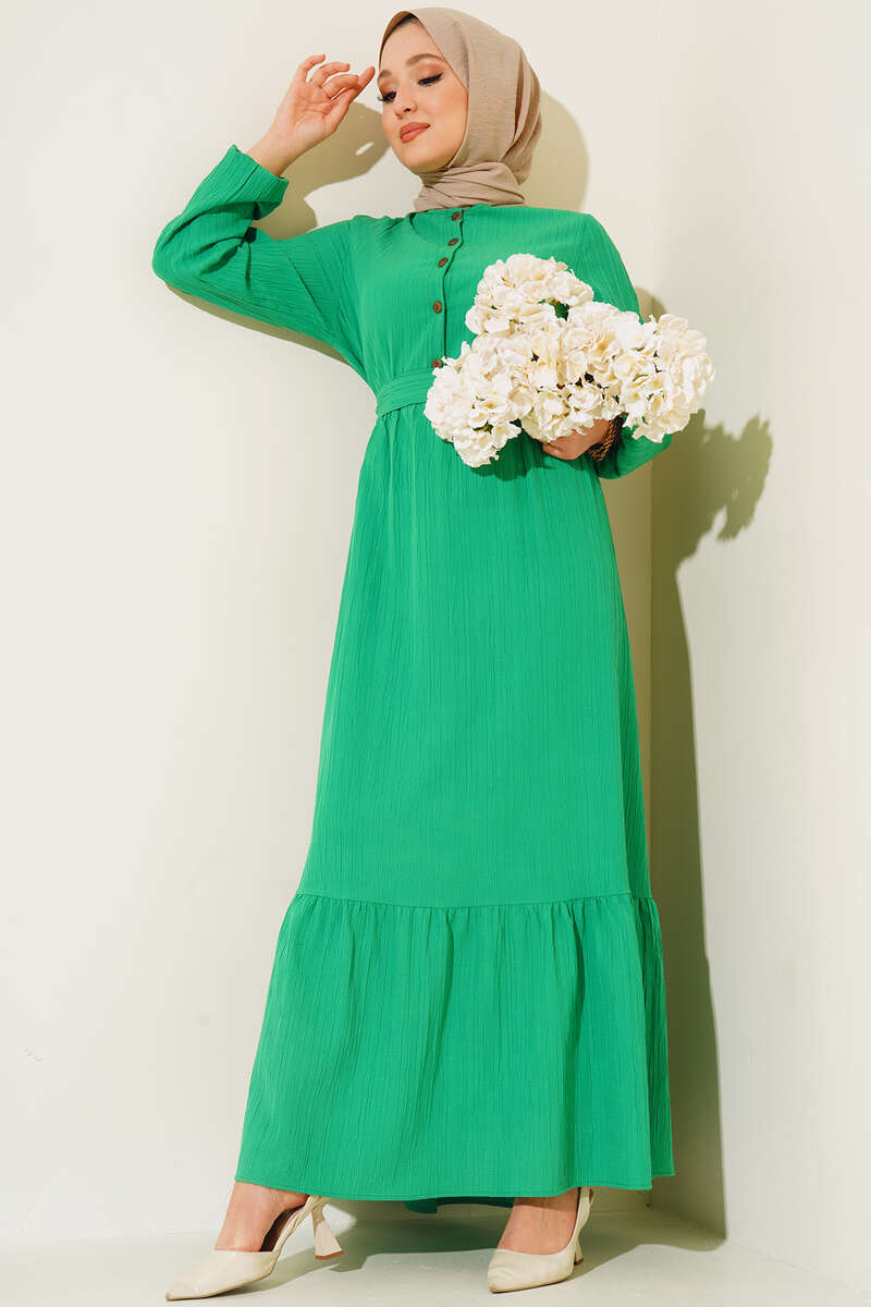 Yeni sezon elbisemiz tarzını yansıtmak isteyenler ilk tercihi olacaktır. Yarı patlı elbsemizin bilekleri lastiklidir. Kuşaklı olan elbisemizin kuşağı kendi kumaş ve rengindedir. İki adet kemer köprüsü bulunmaktadır.