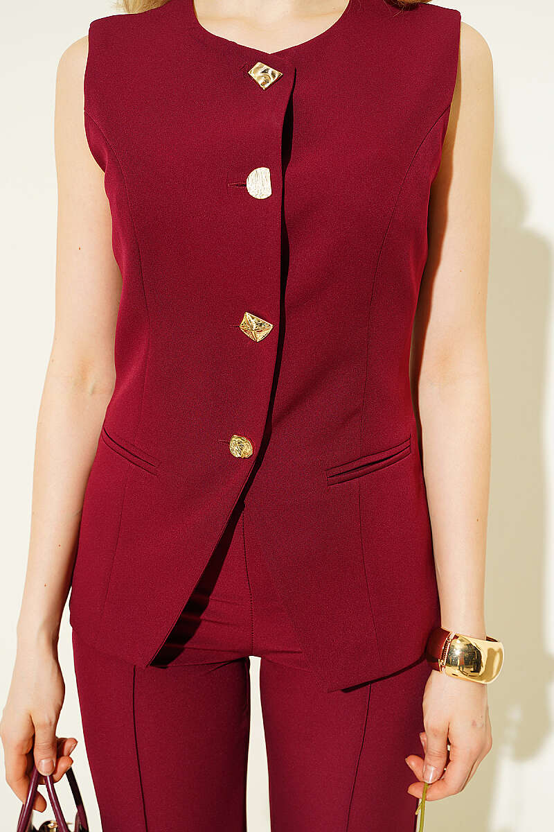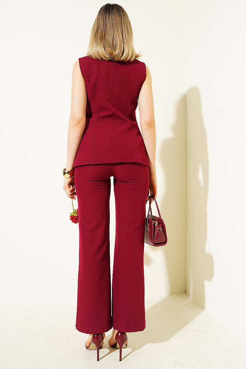 Düğmeli Yelekli Pantolon Takım Bordo