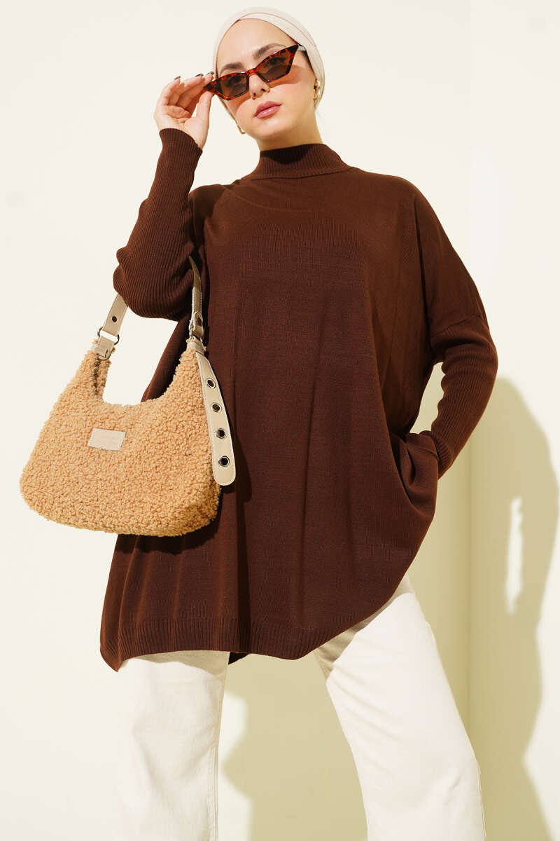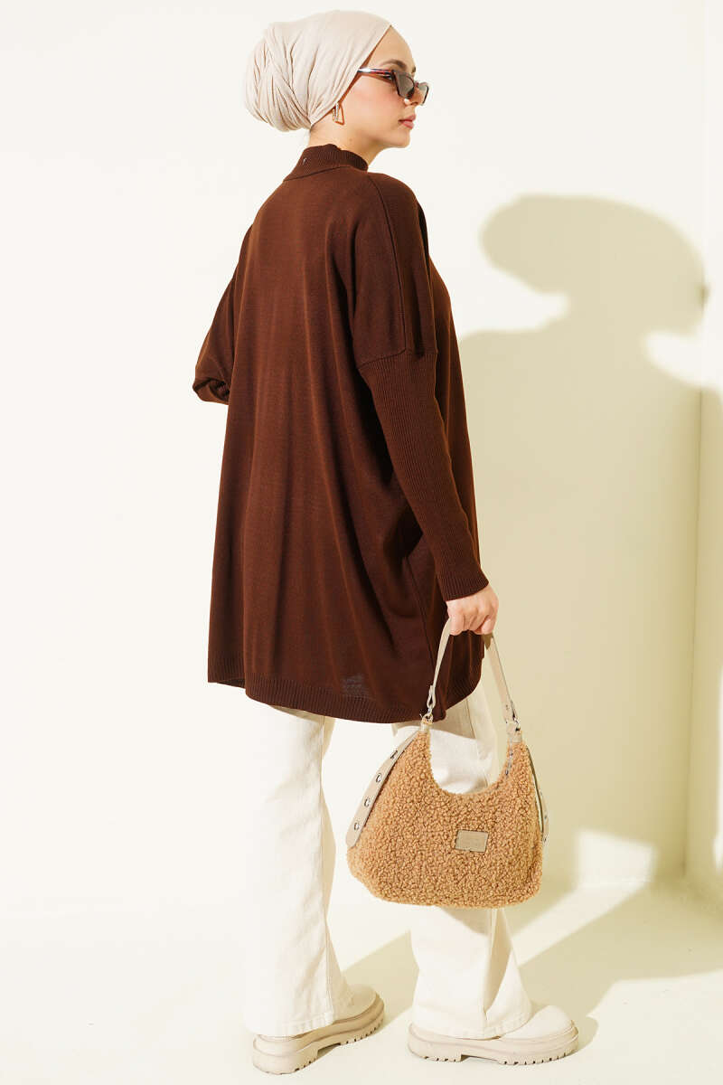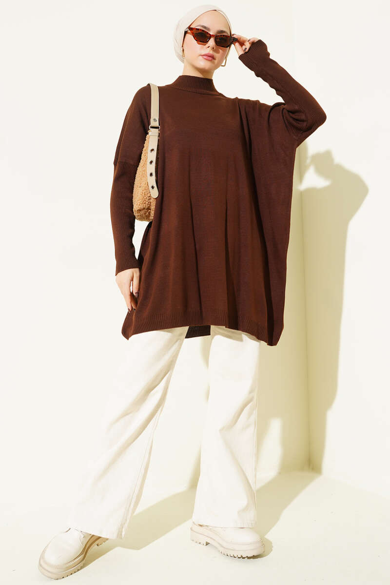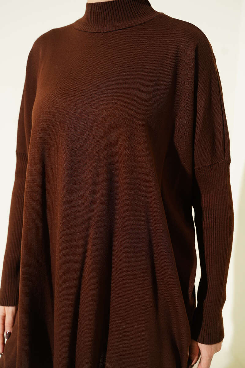 Yatay Çizgi Detaylı Basic Triko Tunik Kahve