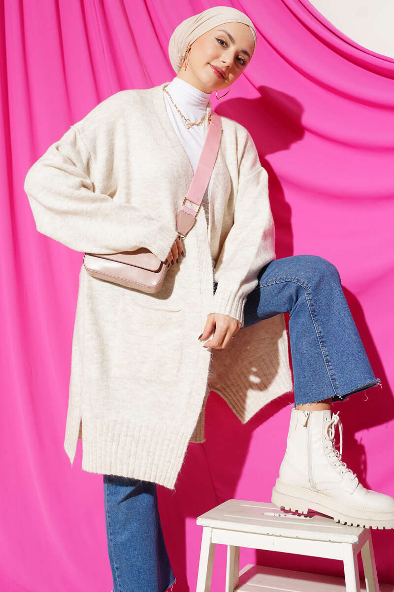 Düşük Omuz Cepli Triko Hırka Kiremit