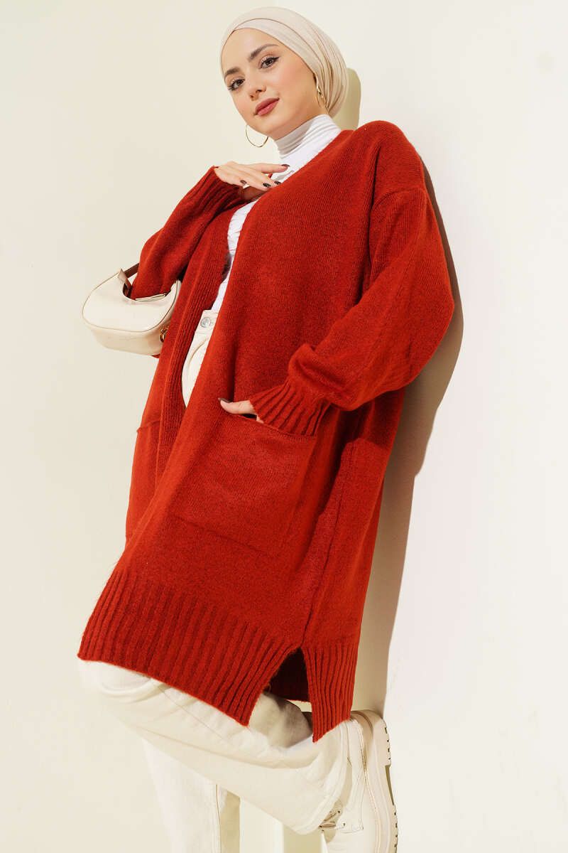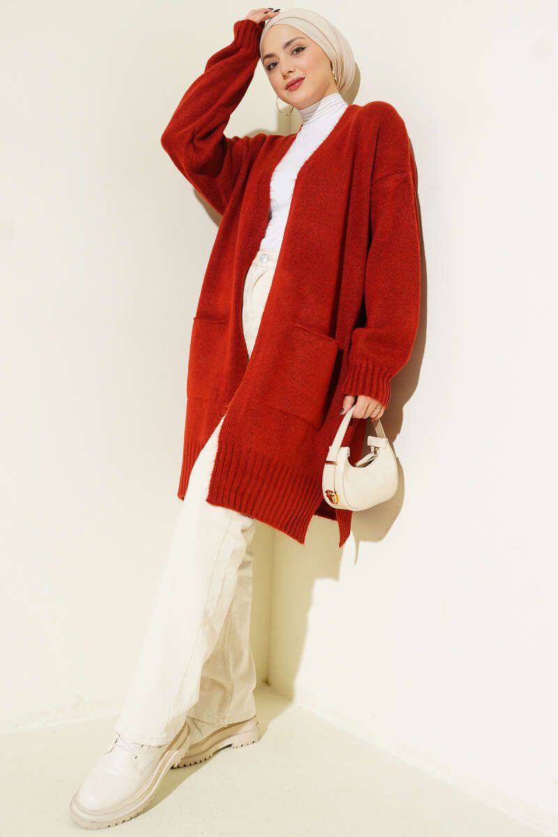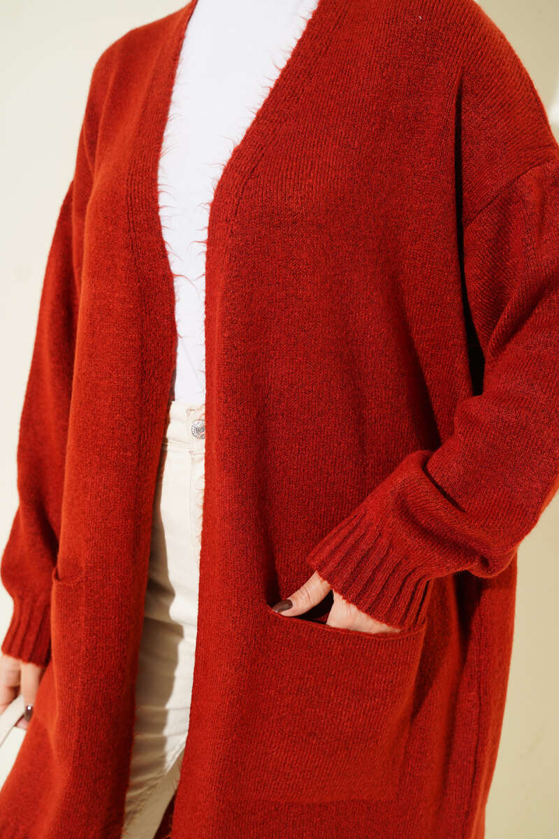 Düşük Omuz Cepli Triko Hırka Bordo