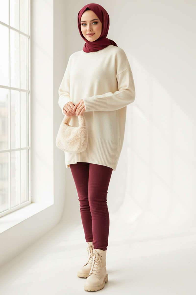 Düşük Omuz Detaylı Triko Tunik Ekru
