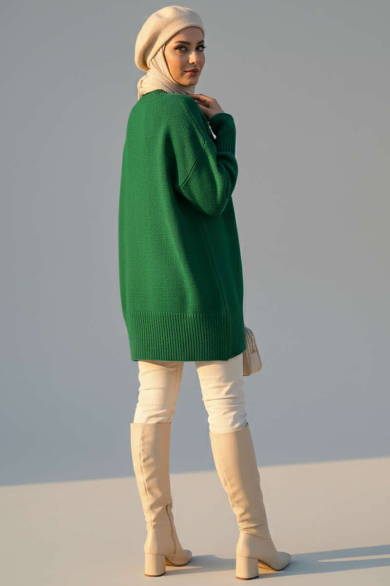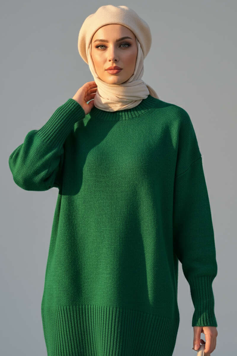 Düşük Omuz Detaylı Triko Tunik Yeşil