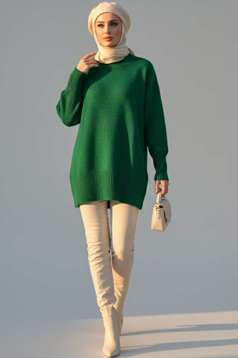 Kare Kabartmalı Yumoş Triko Tunik Yağ Yeşili