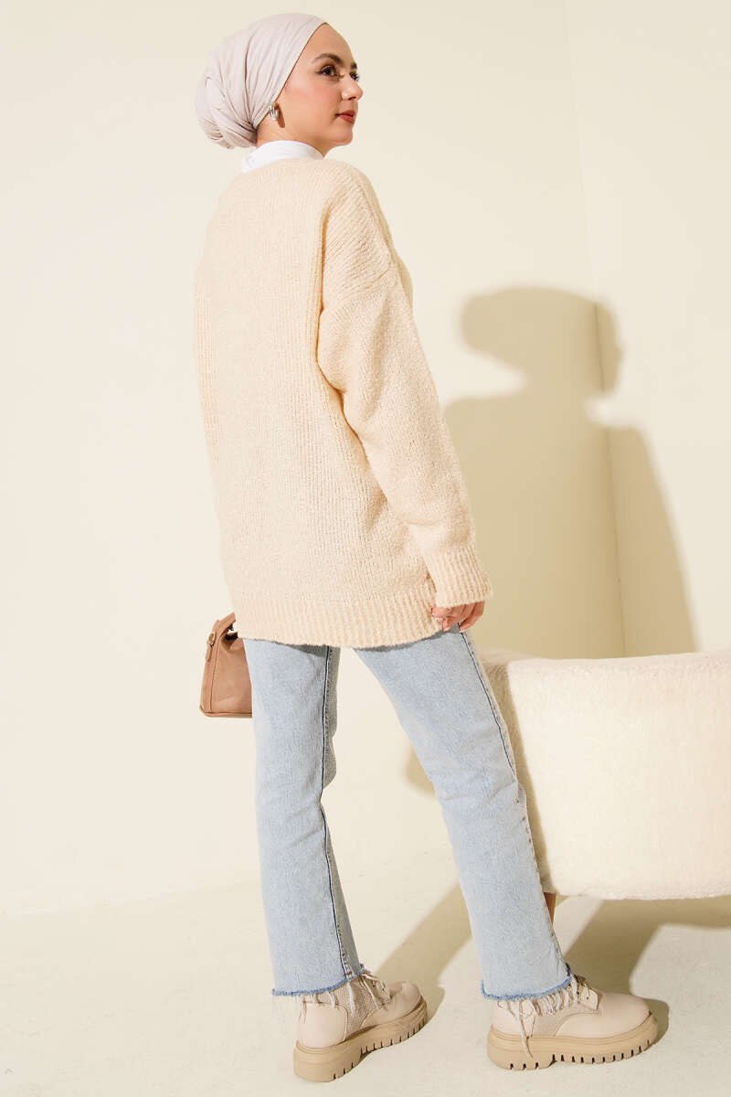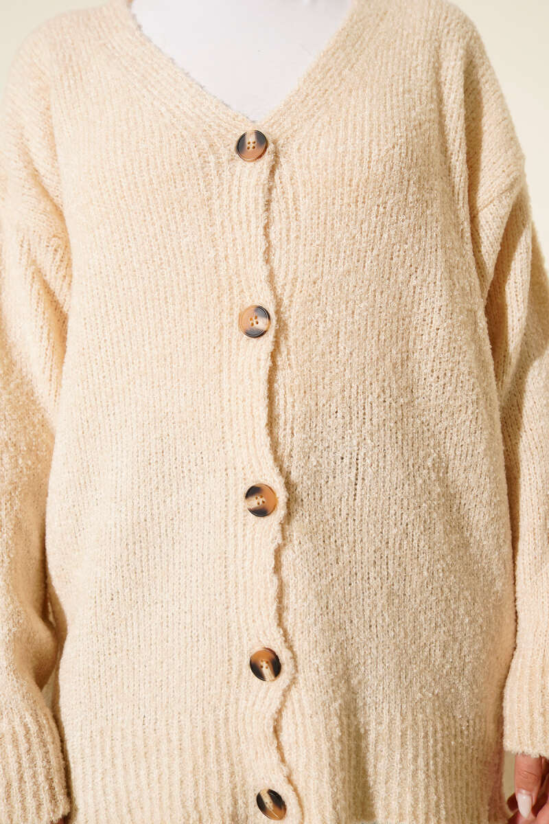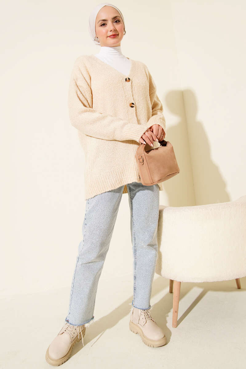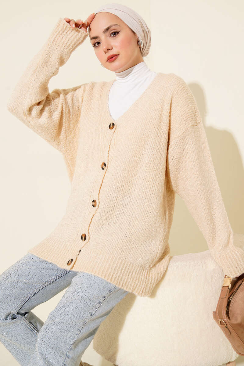 Düşük Omuz Düğmeli Triko Hırka Bej