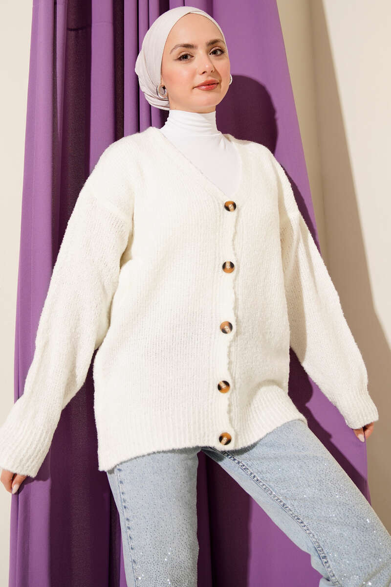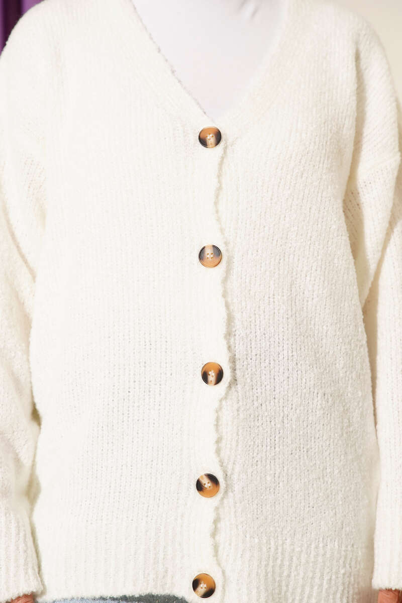 Düşük Omuz Düğmeli Triko Hırka Ekru