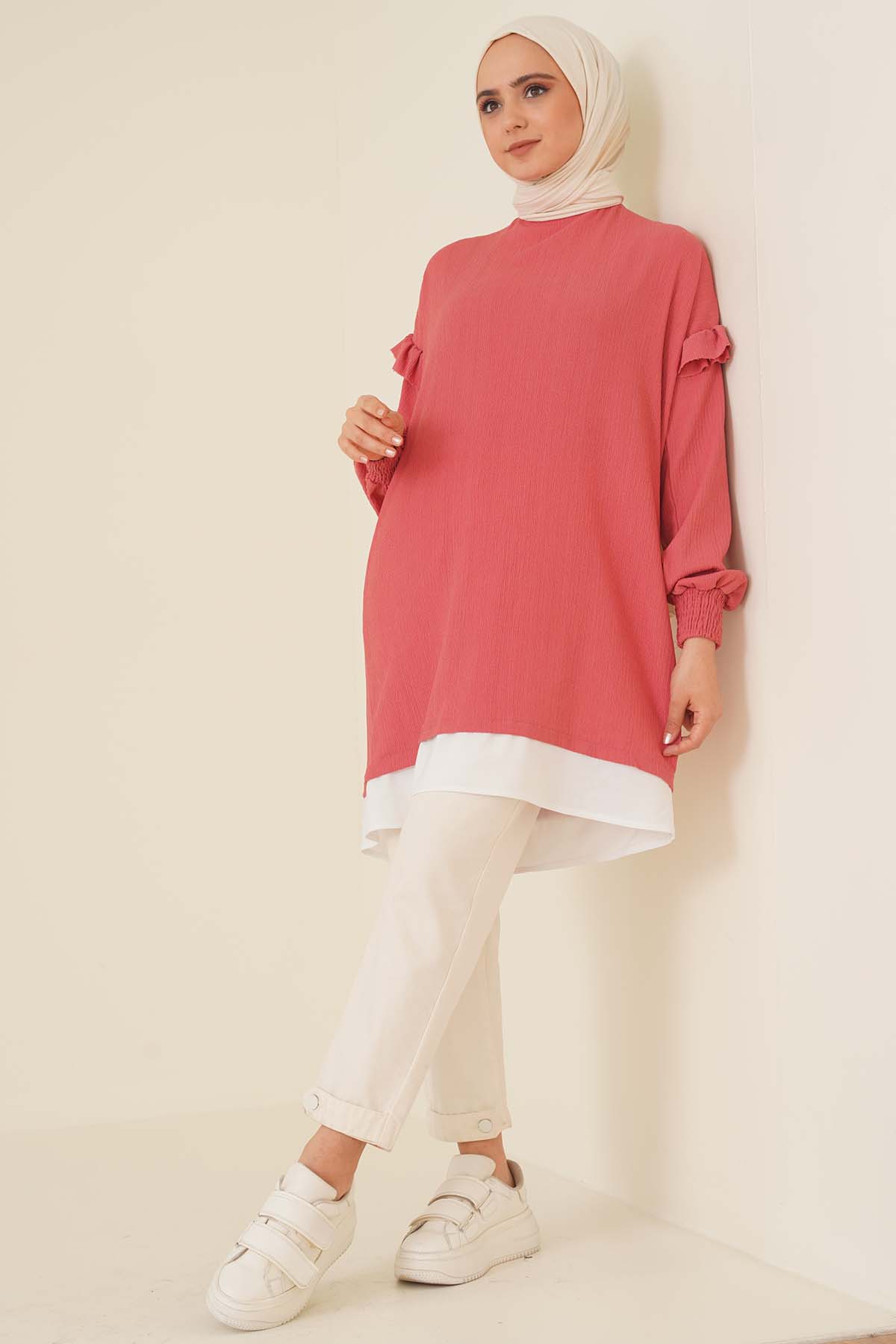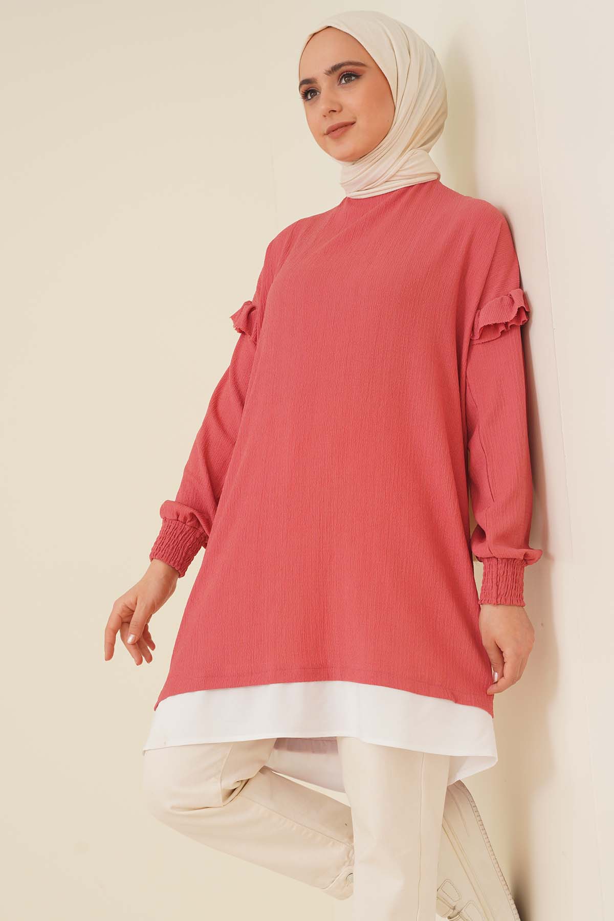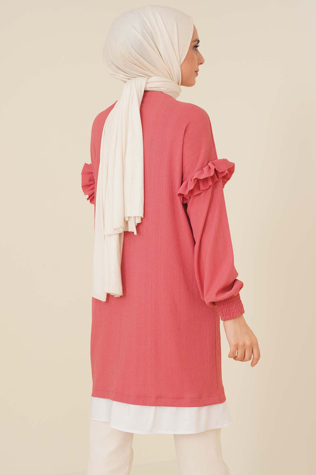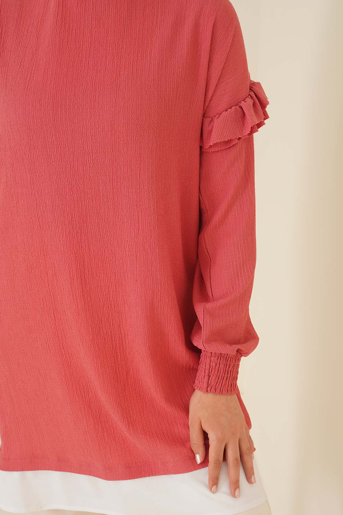 Düşük Omuz Kolları Fırfırlı Tunik Gül Kurusu