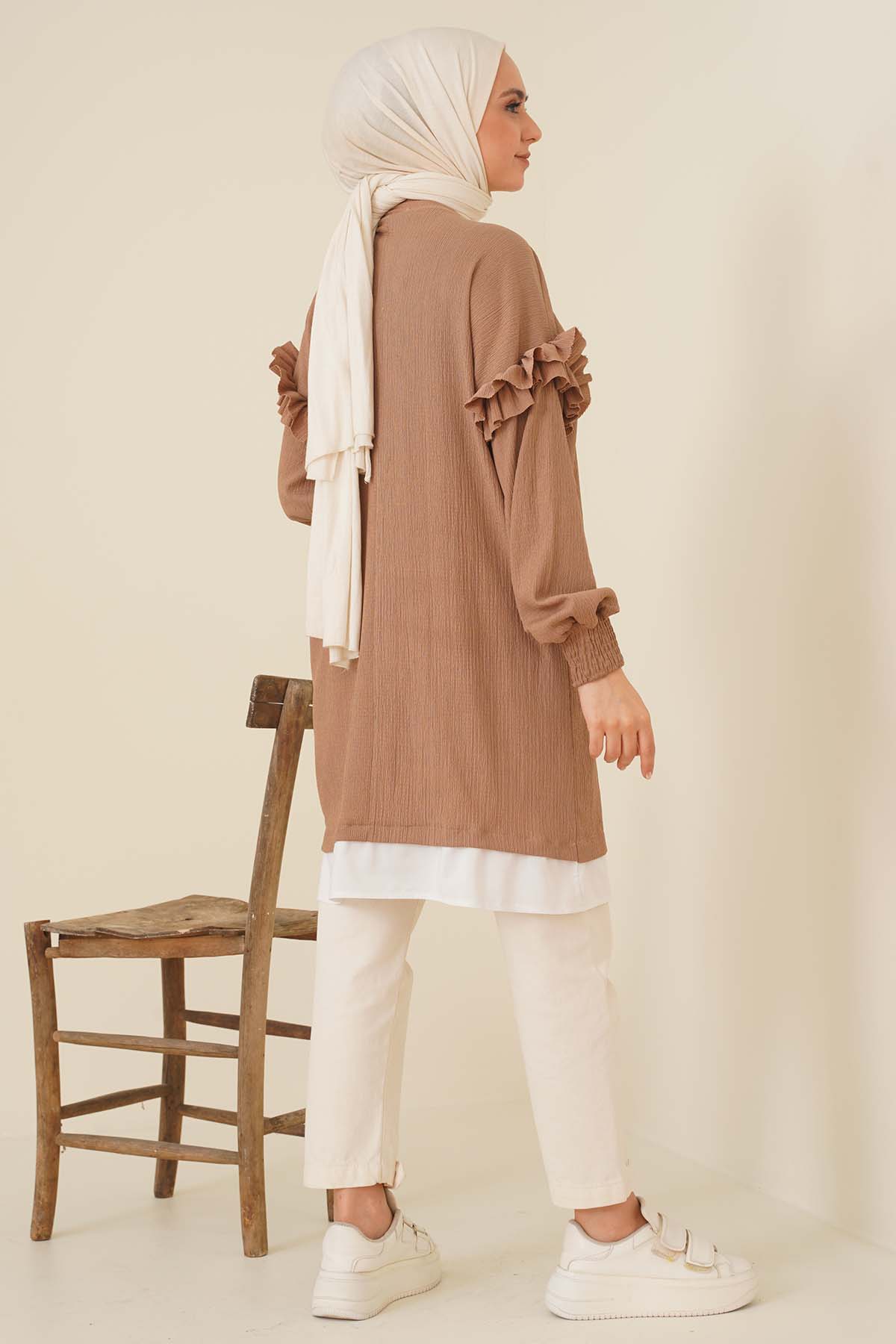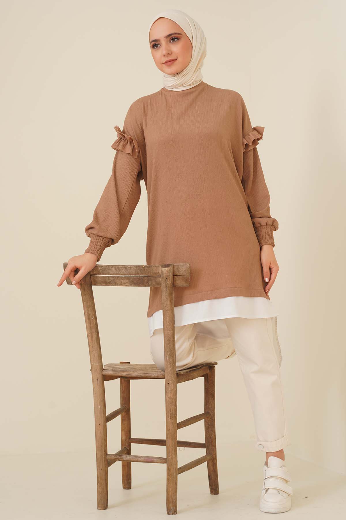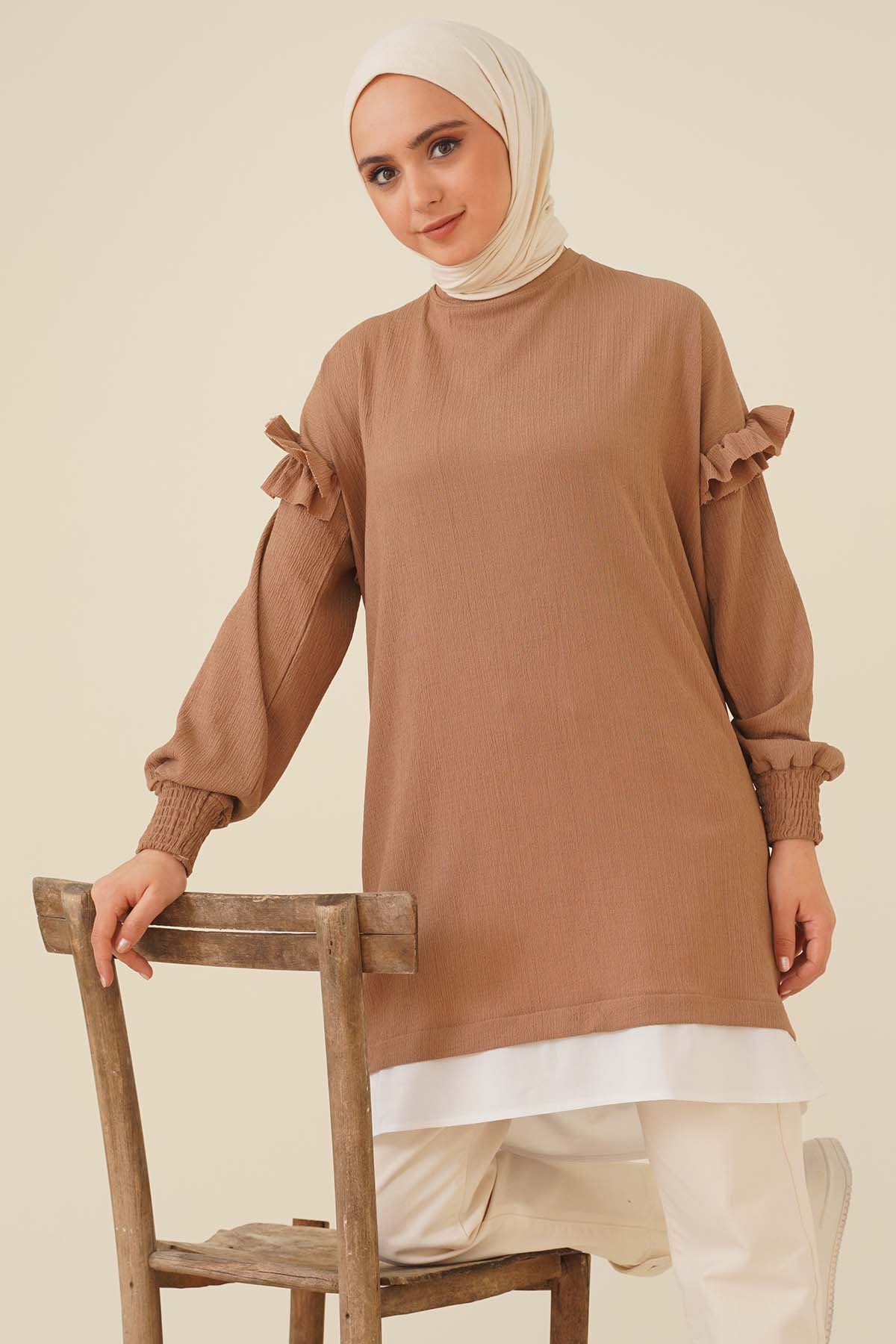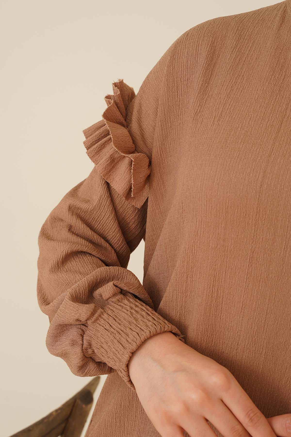 Düşük Omuz Kolları Fırfırlı Tunik Latte