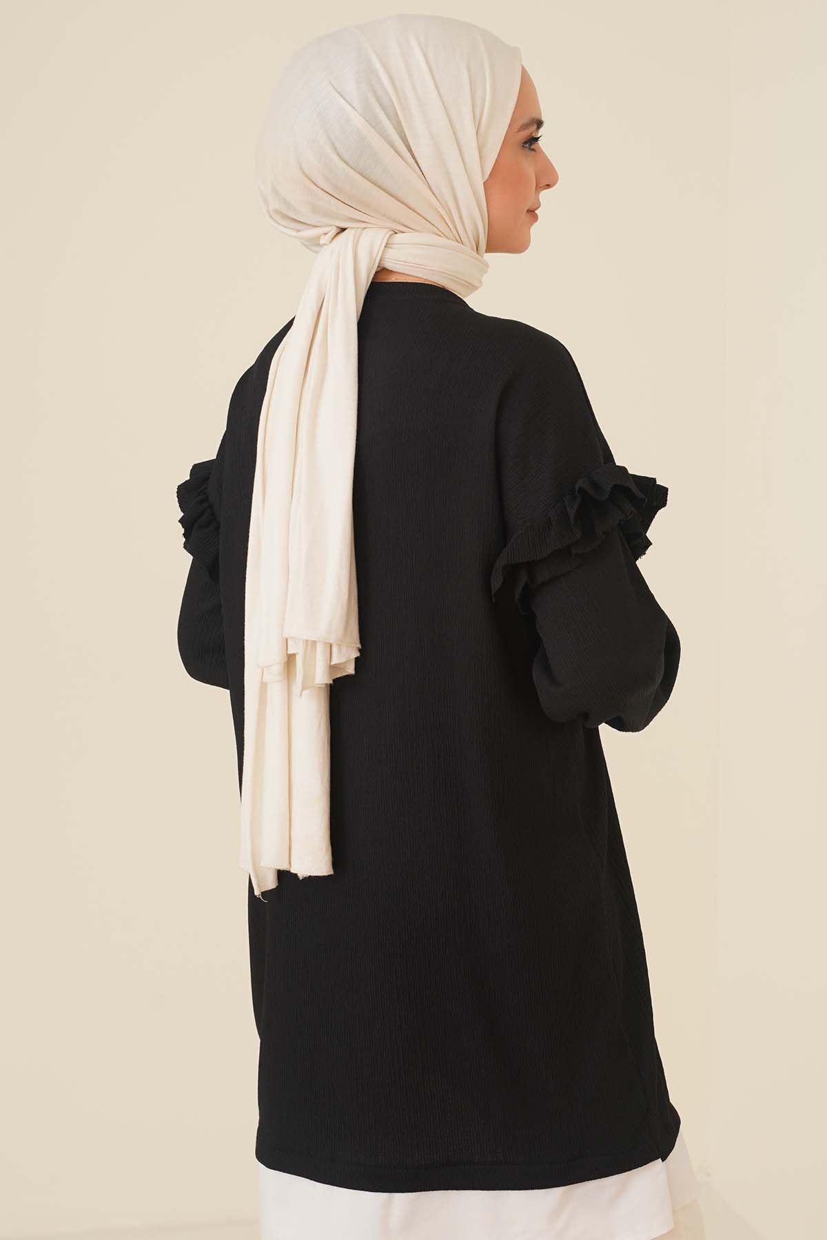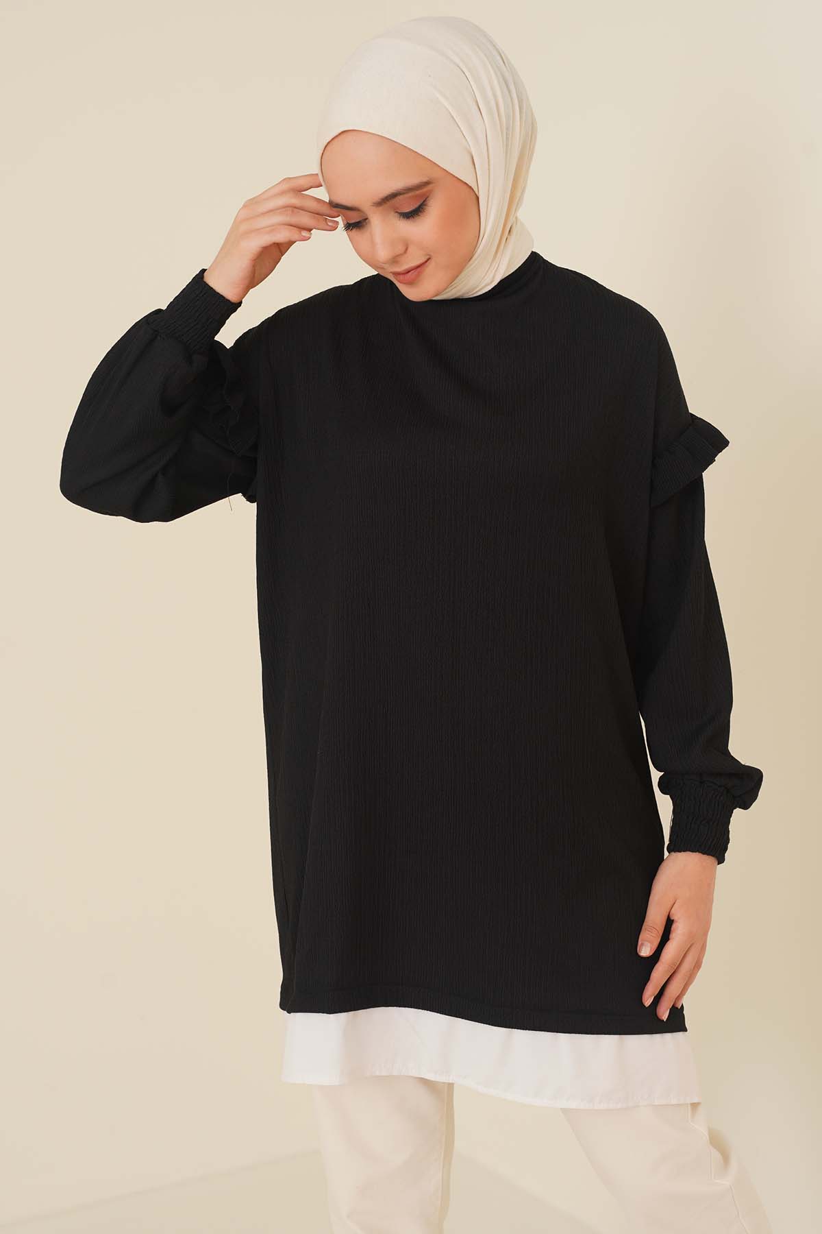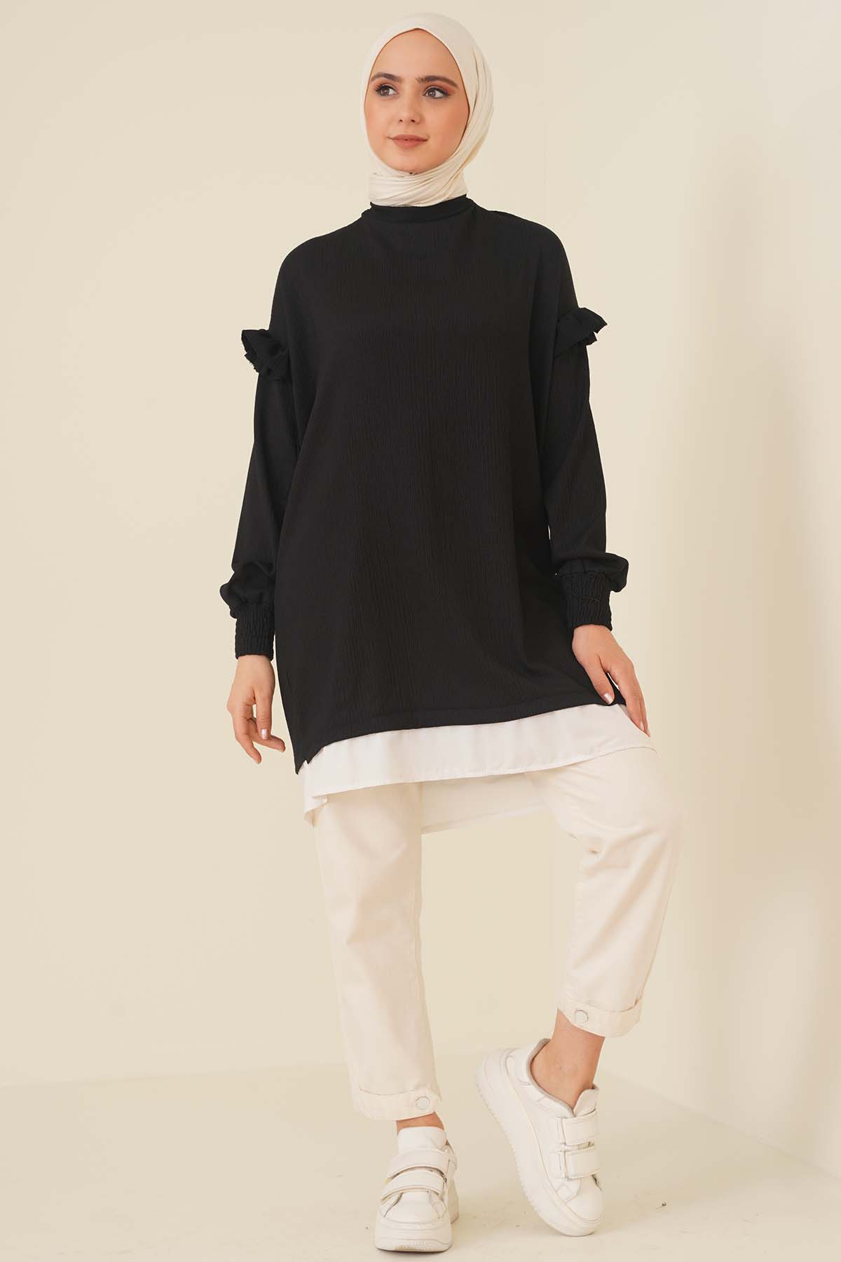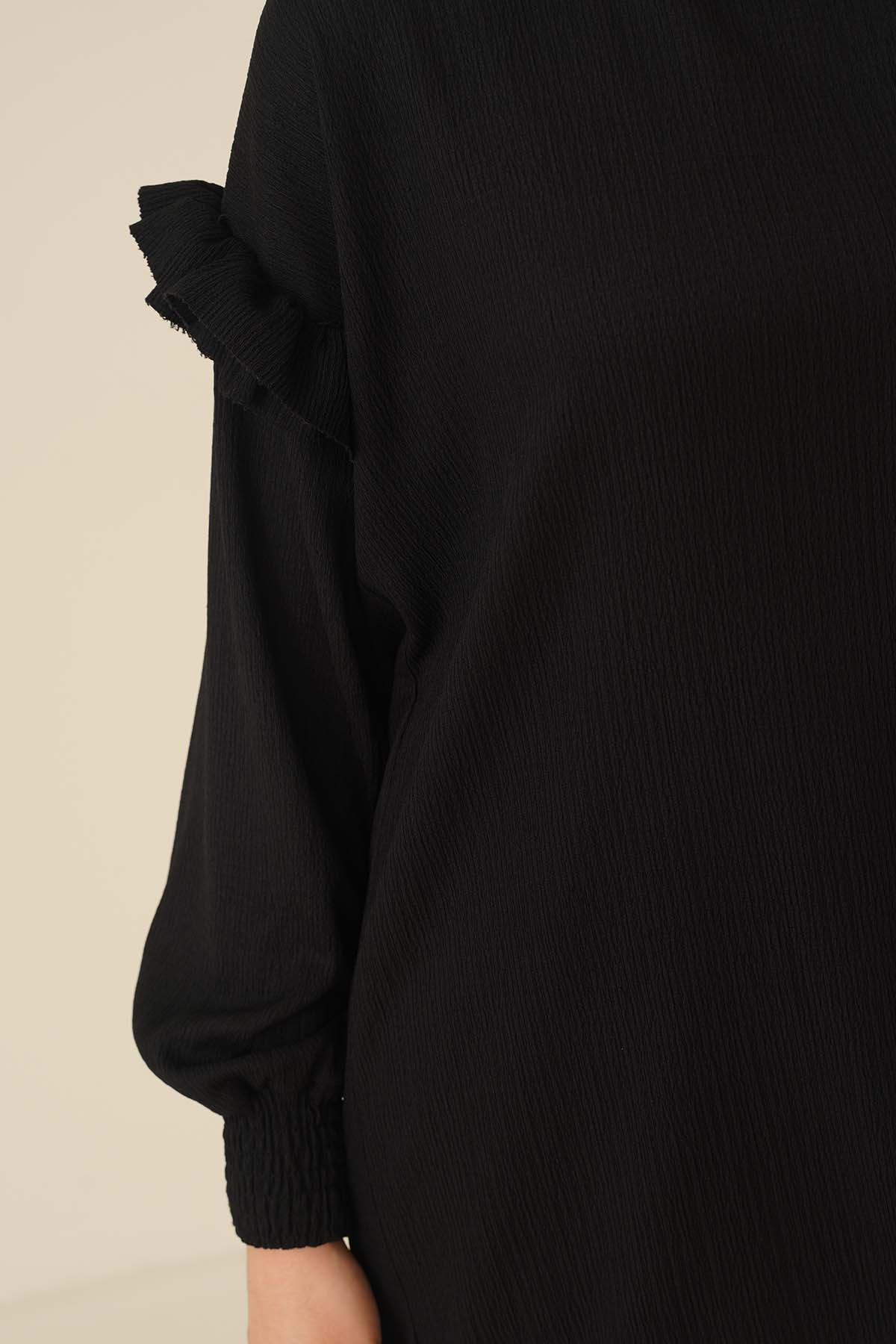 Düşük Omuz Kolları Fırfırlı Tunik Siyah