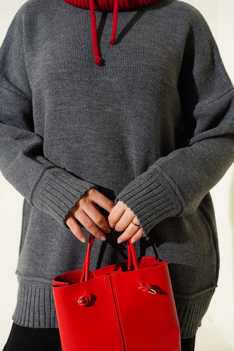 Gömlek Yaka Fularlı Triko Tunik Bordo