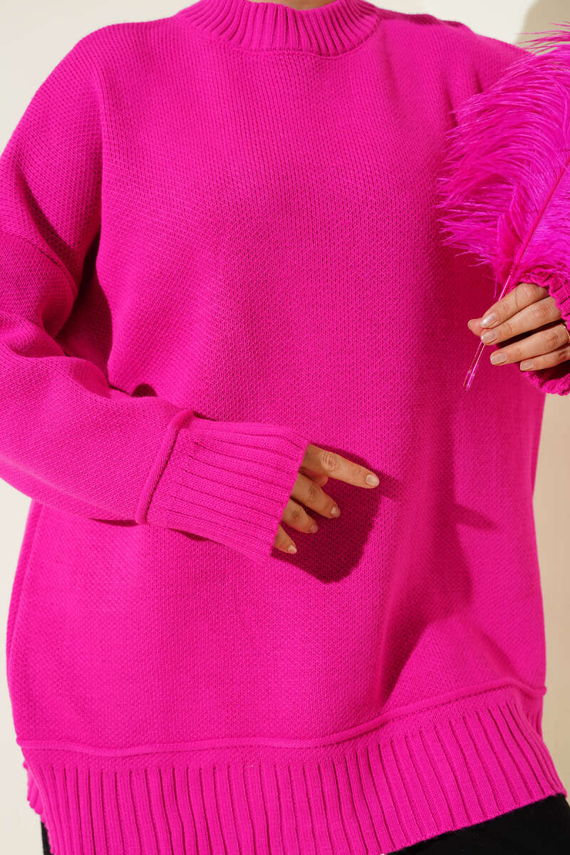 Düşük Omuz Oversize Triko Tunik Fuşya