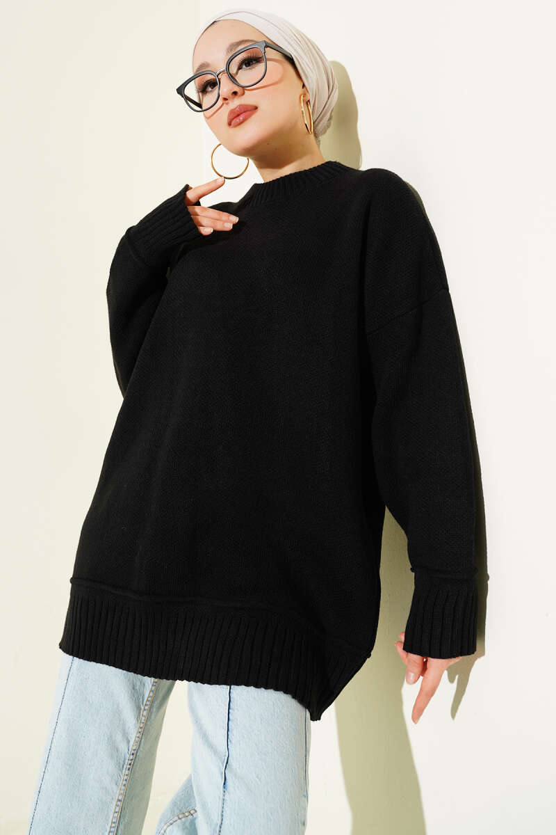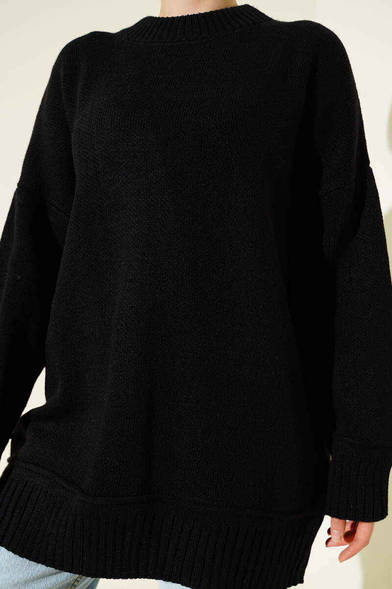 Yatay Çizgili Balon Kol Triko Tunik Siyah