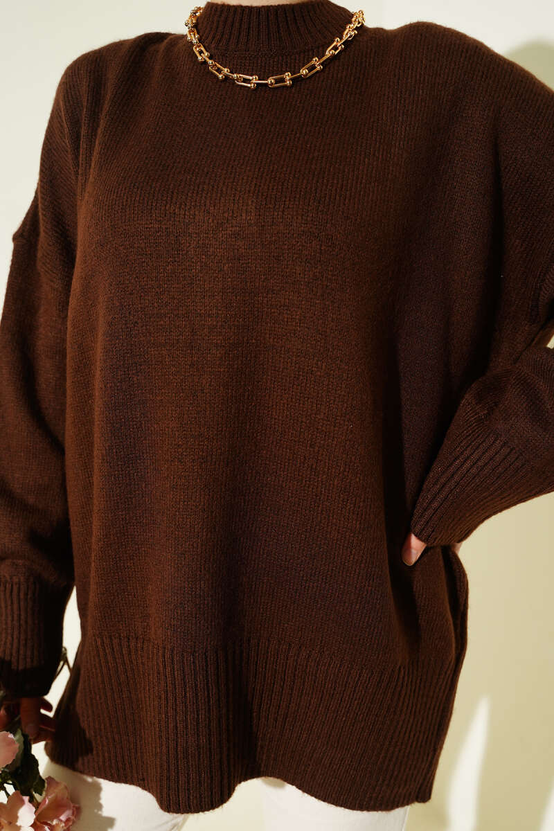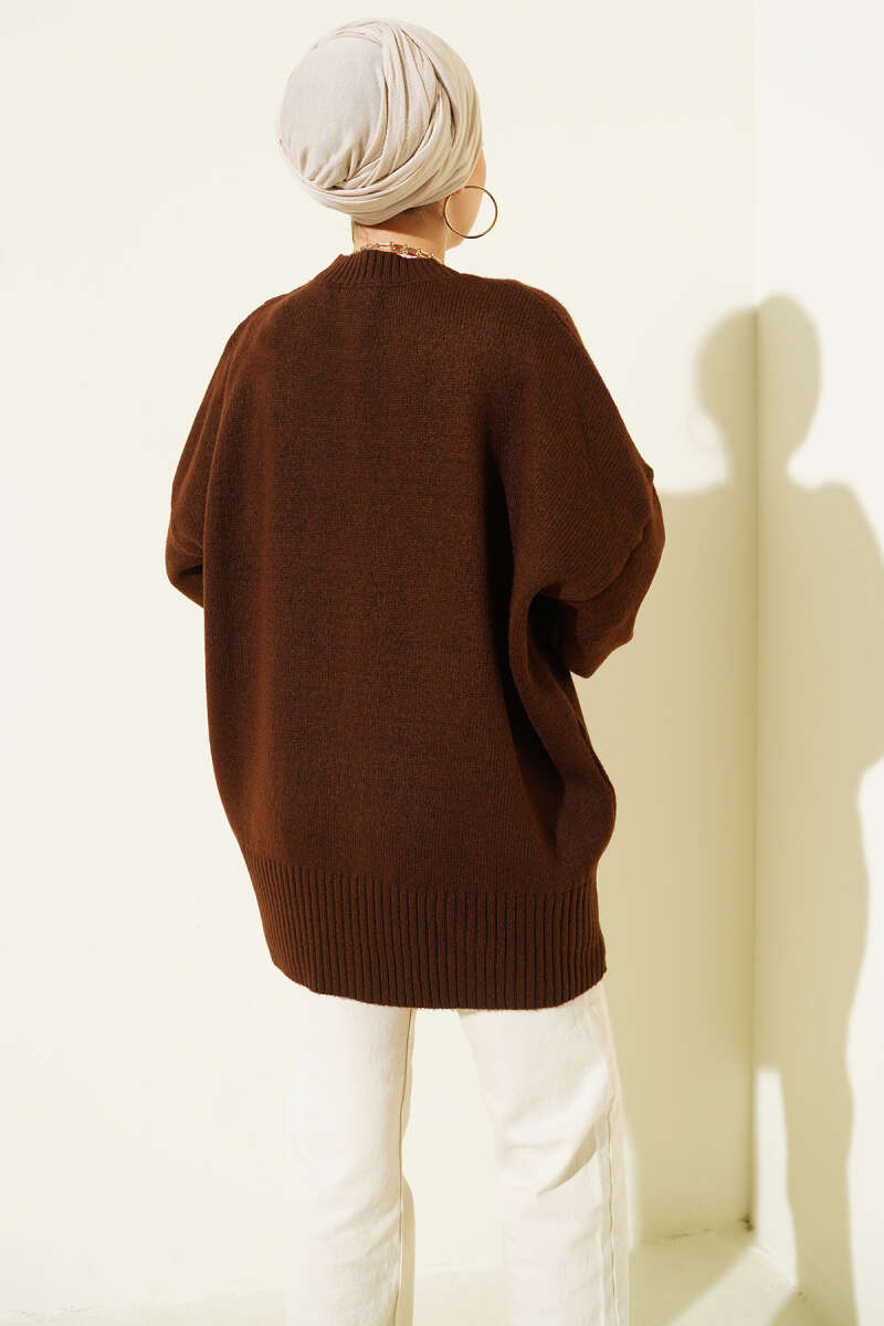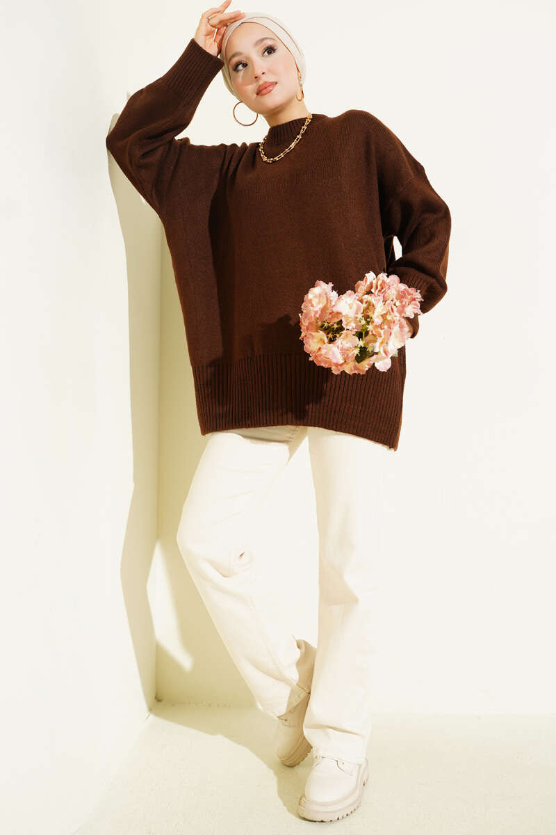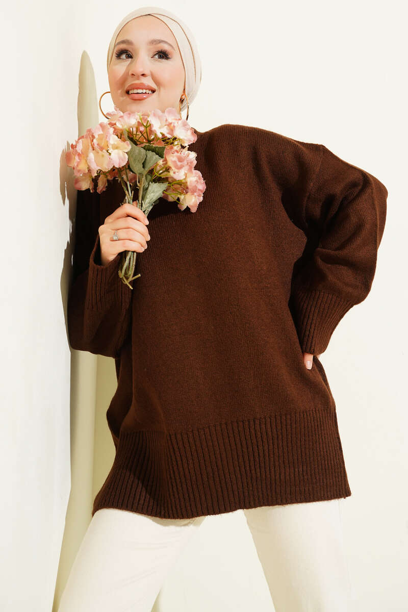 Düşük Omuz Salaş Triko Tunik Kahve