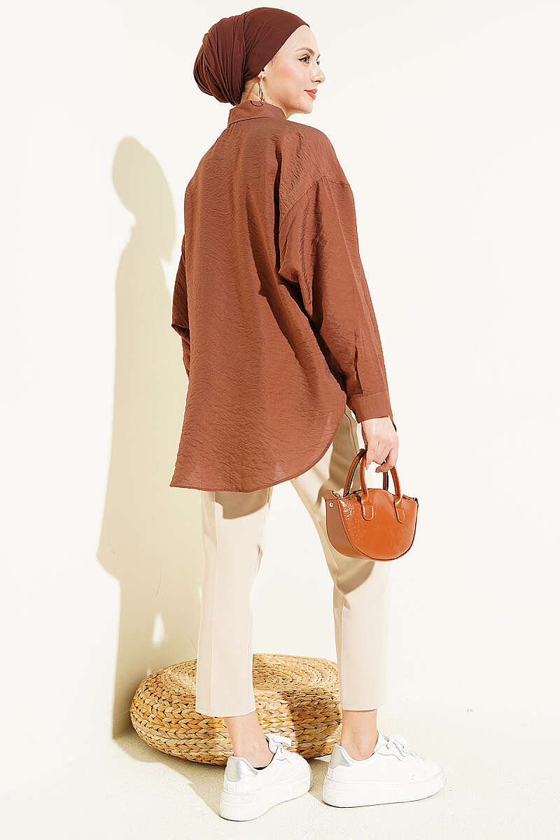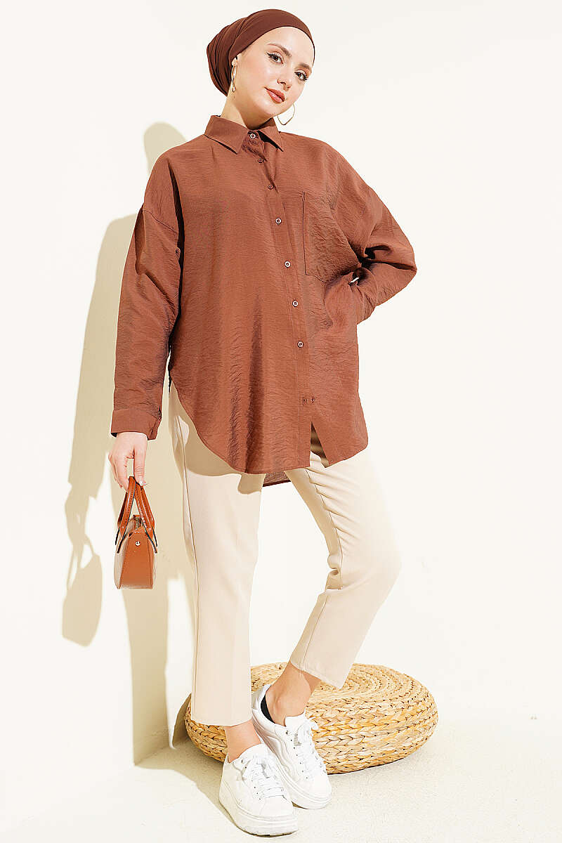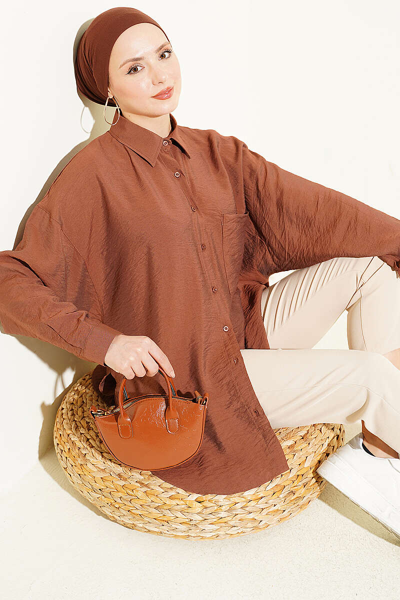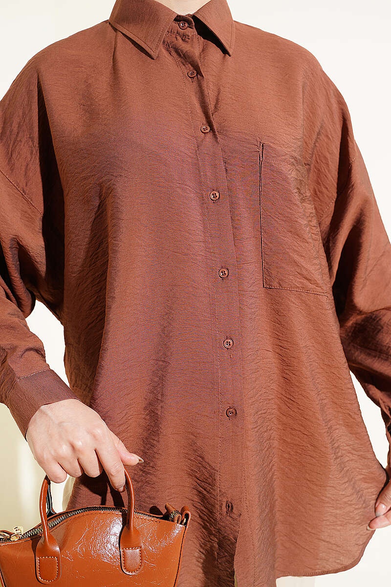 Düşük Omuzlu Tek Cepli Gömlek Kahve
