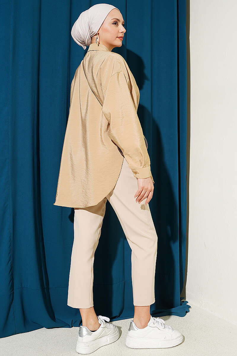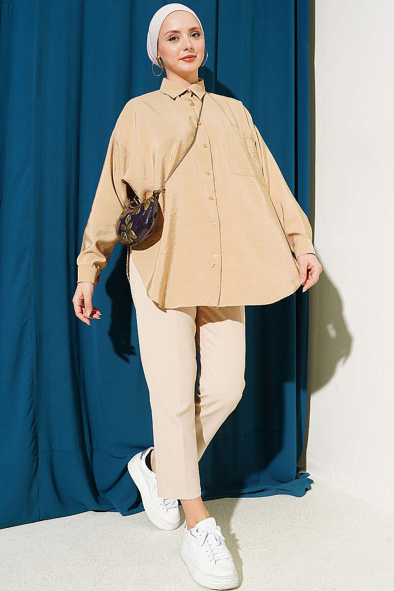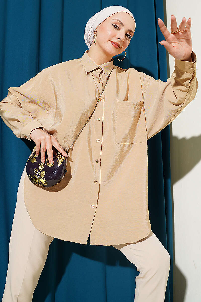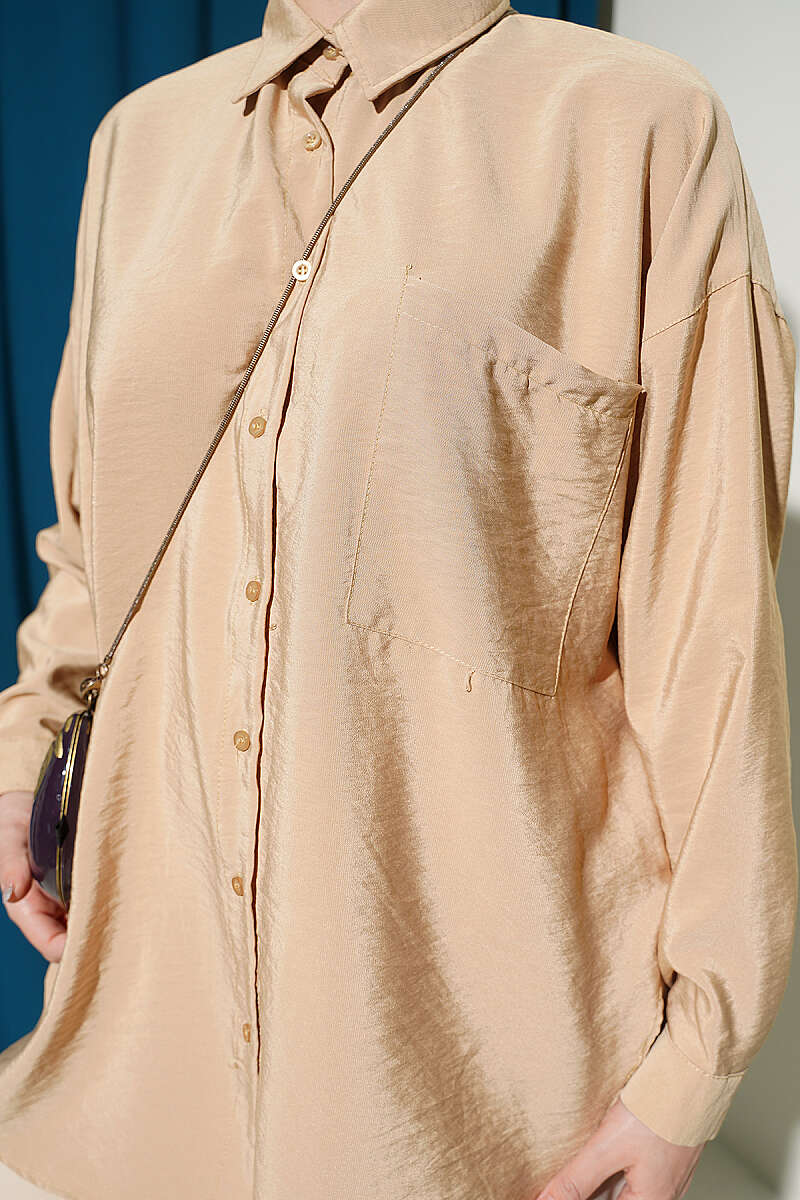 Düşük Omuzlu Tek Cepli Gömlek Kum Bej
