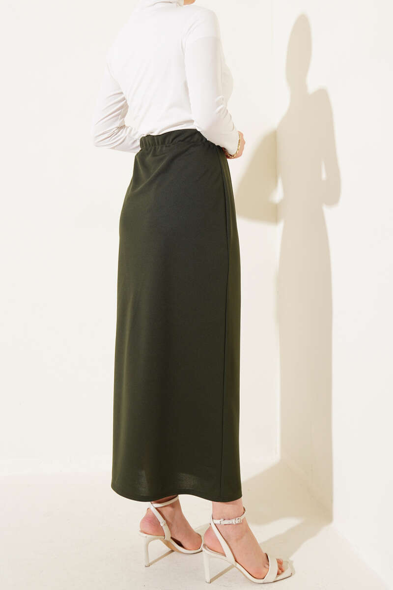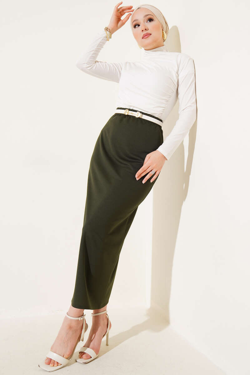 Kemer Aksesuarlı Ekoseli Etek Haki