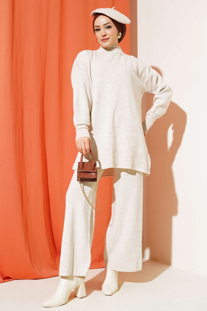 Taşlı Baklava Desen Triko İkili Takım Bej