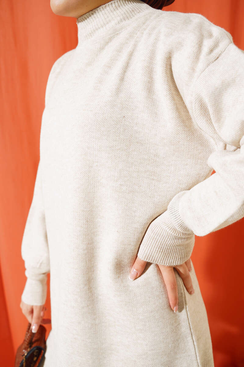 Bel Bağcıklı Bisiklet Yaka Triko Elbise Bej