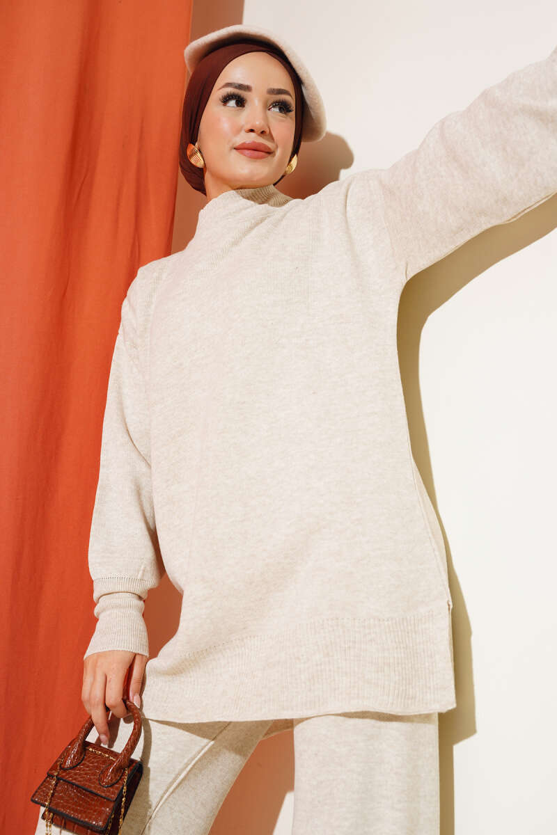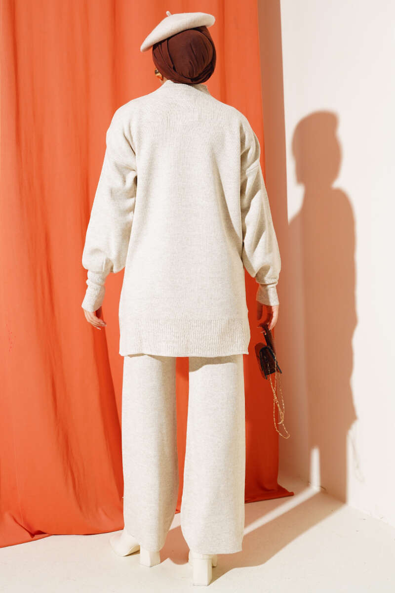 Balon Kol Balıkçı Yaka Triko İkili Takım Taş
