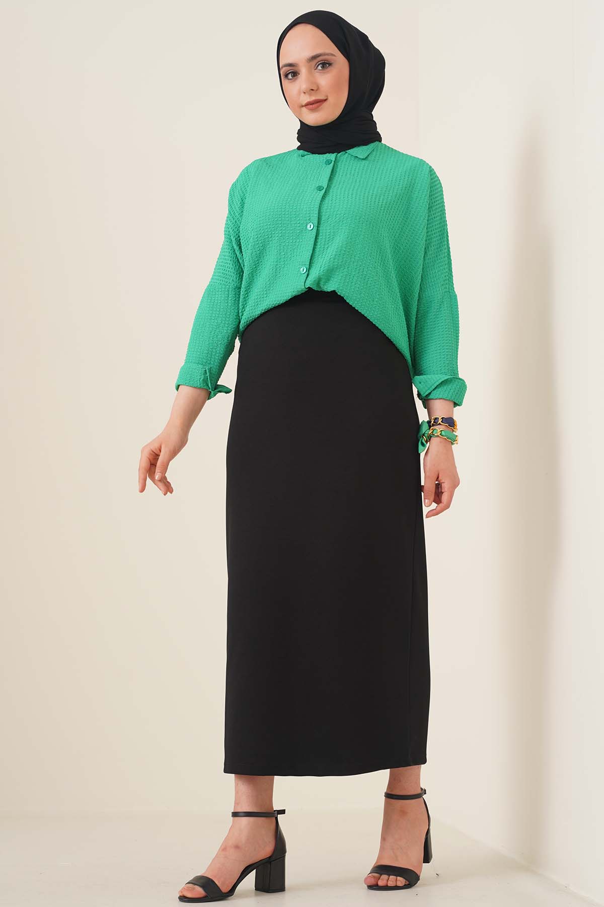 Hem şık hem spor etekle gözler üzerinizde olacak. İster bluz ister tuniklerinizle rahatlıkla şık yada spor kombinleyebileceğiniz eteğe dolabınızda yer açmanın tam zamanı. Eteğin beli lastikli olup konforlu kullanım sunmaktadır. Astarsızdır.