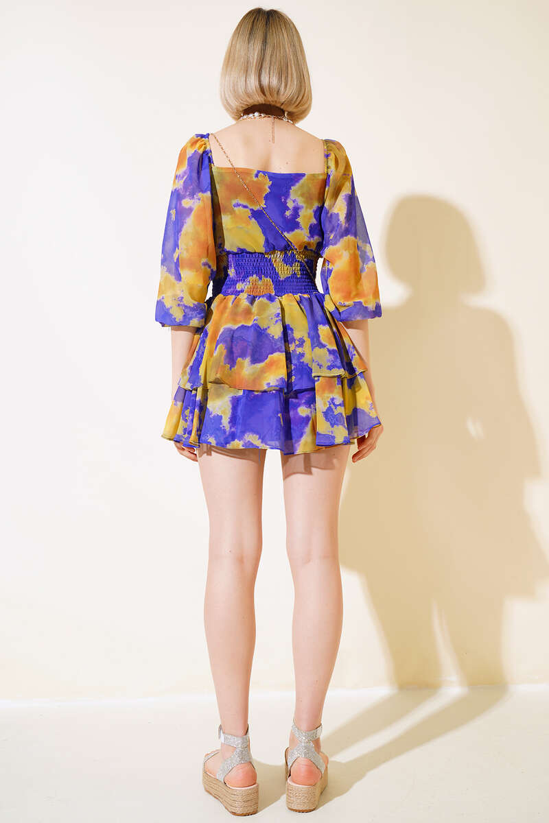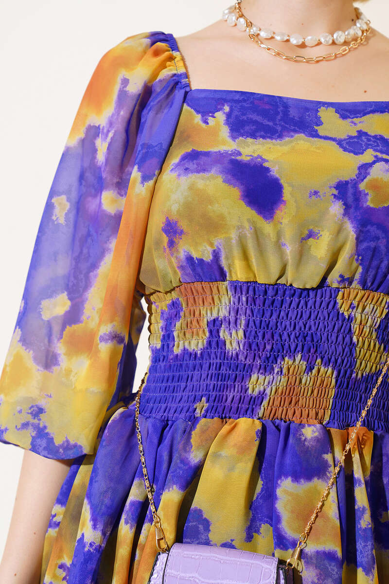 Yeni sezon elbise modelimiz sizlerle beraber. Elbisemiz kendinden desenlidir. Yakası kayık yakadır. Omuzları lastiklidir. Kolları uzun kol olup kol bilekleri lastik büzgülüdü. Beli lastik büzgülüdür. Eteği kat kat  ve fırfırlıdır. Elbisemiz hareketli duruşuyla yaz günlerinizin vazgeçilmezi olacaktır.