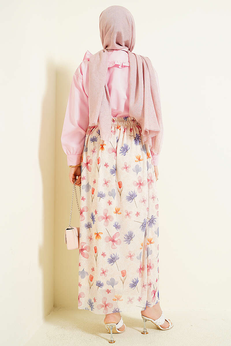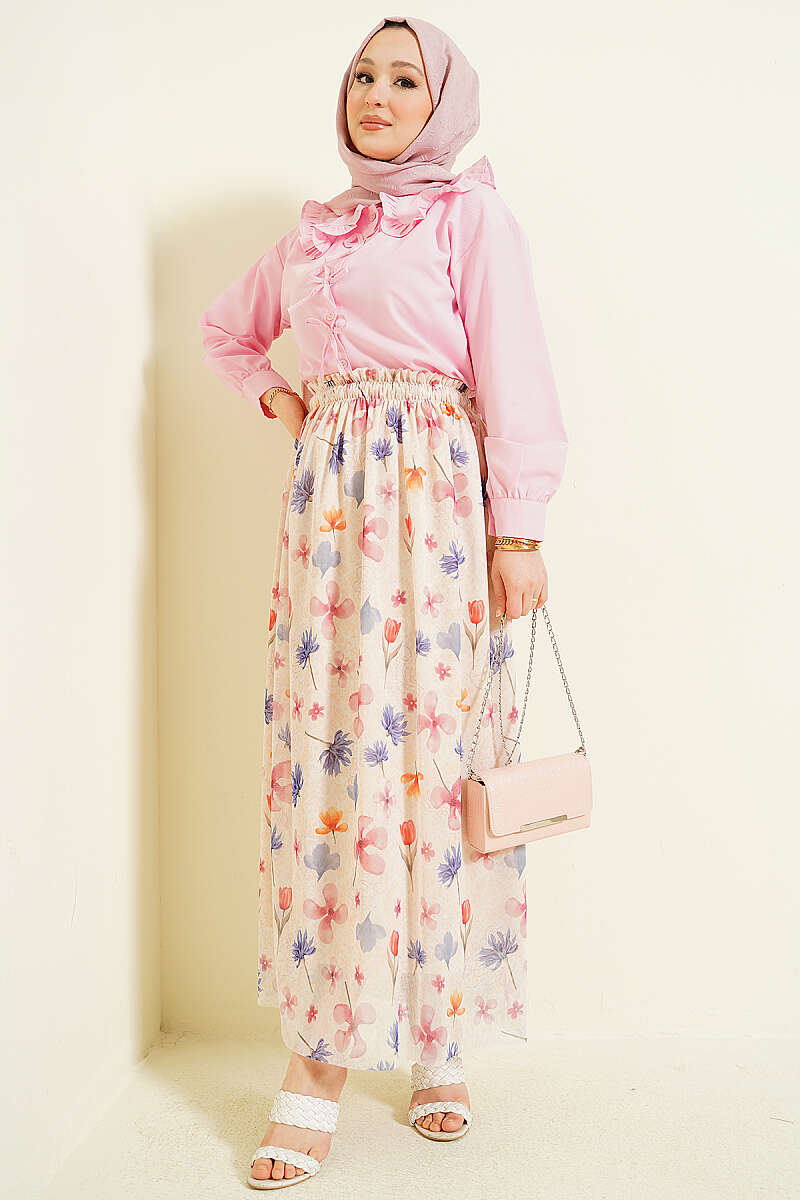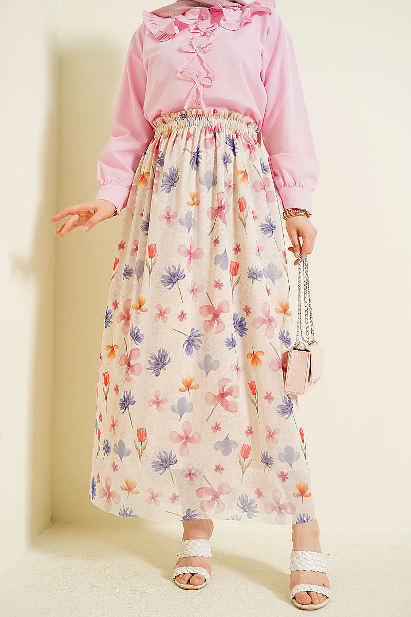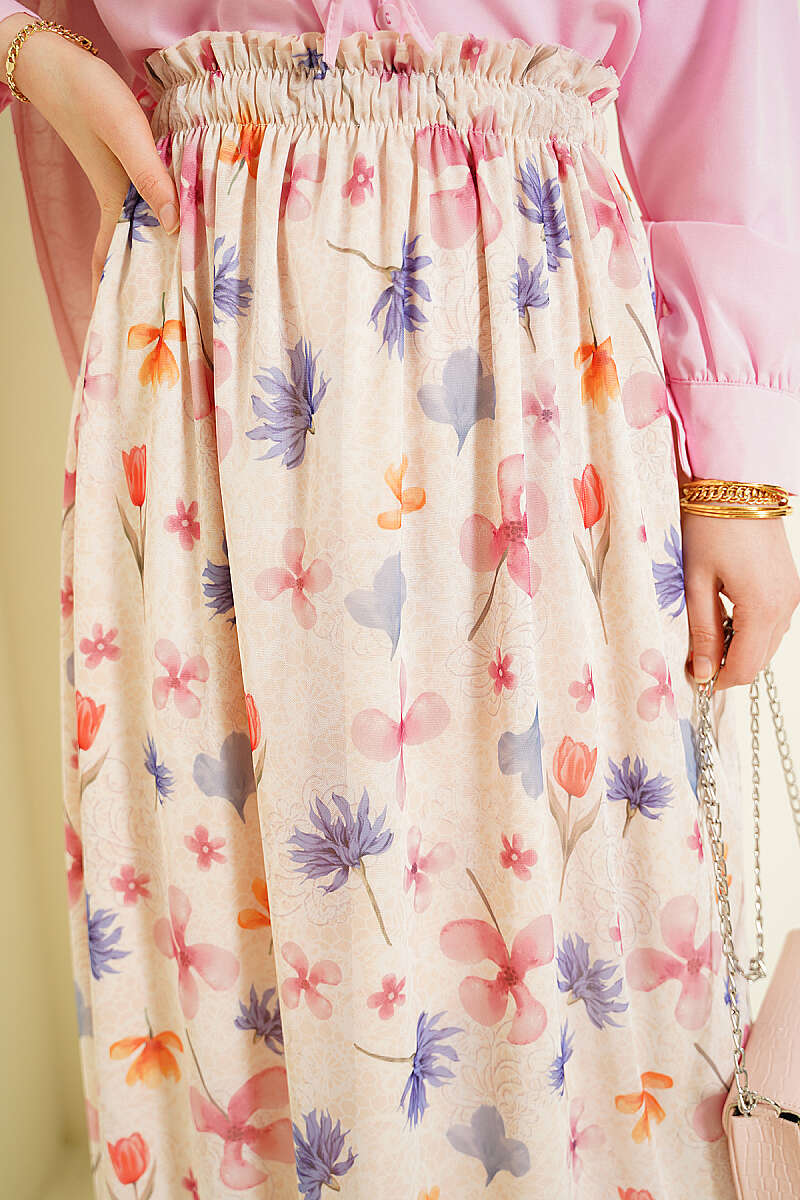 Ebruli Çiçekli Tül Etek Bej