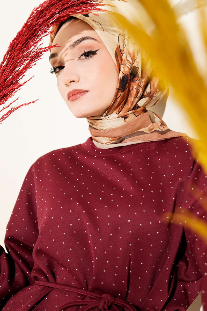 Kapüşonlu Yarım Fermuarlı Baskılı Tunik Bordo