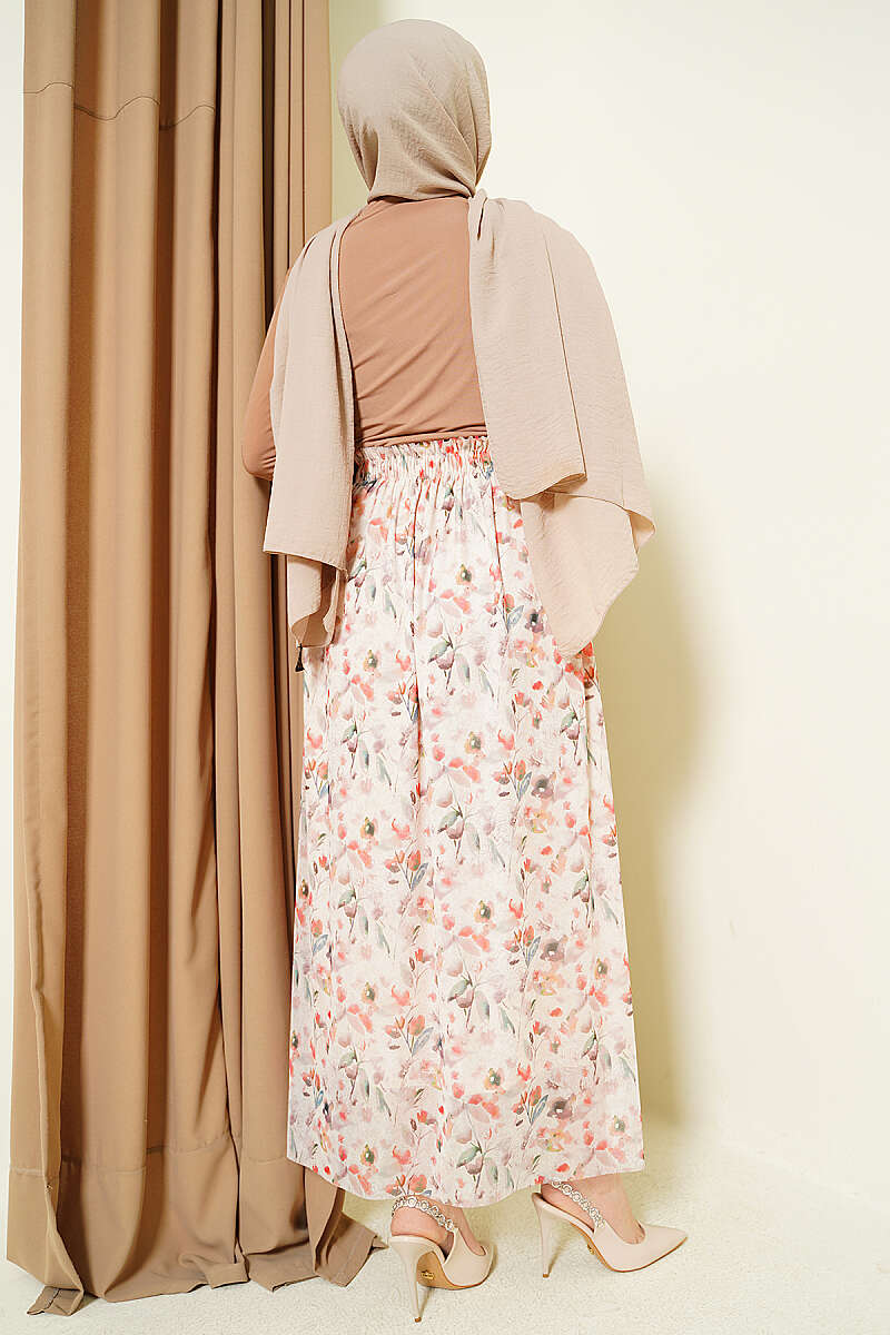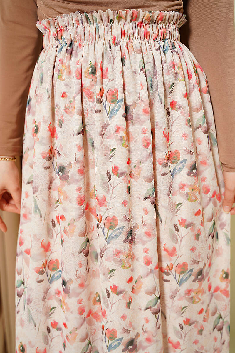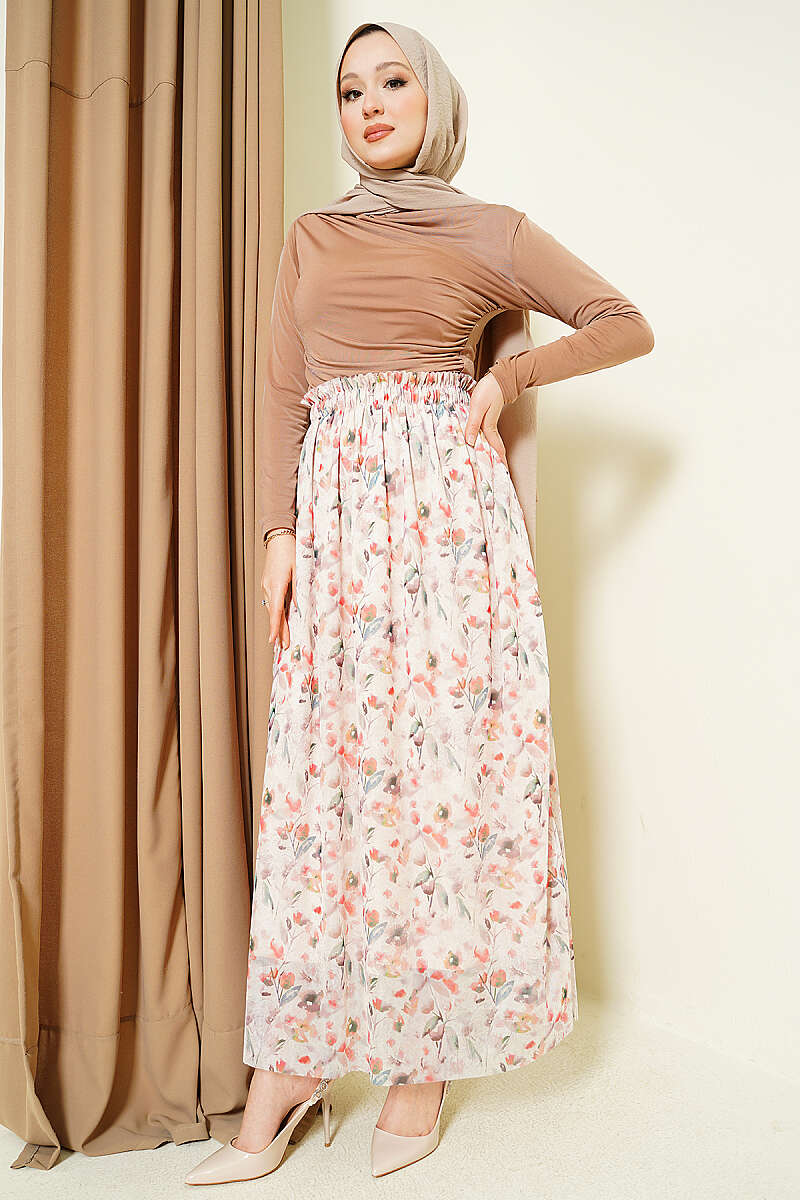 Ebruli Çiçekli Tül Etek Bej