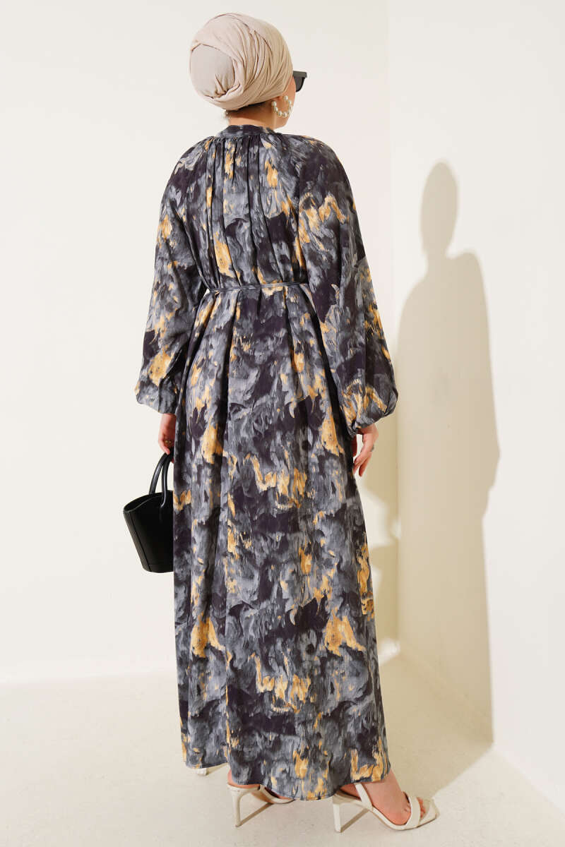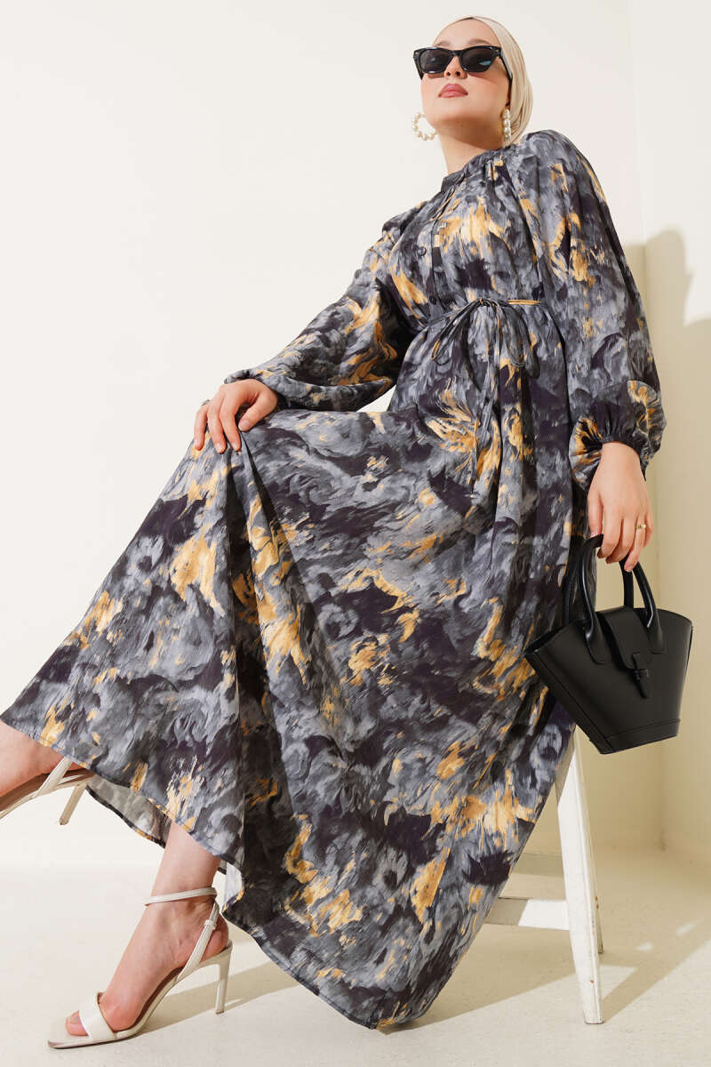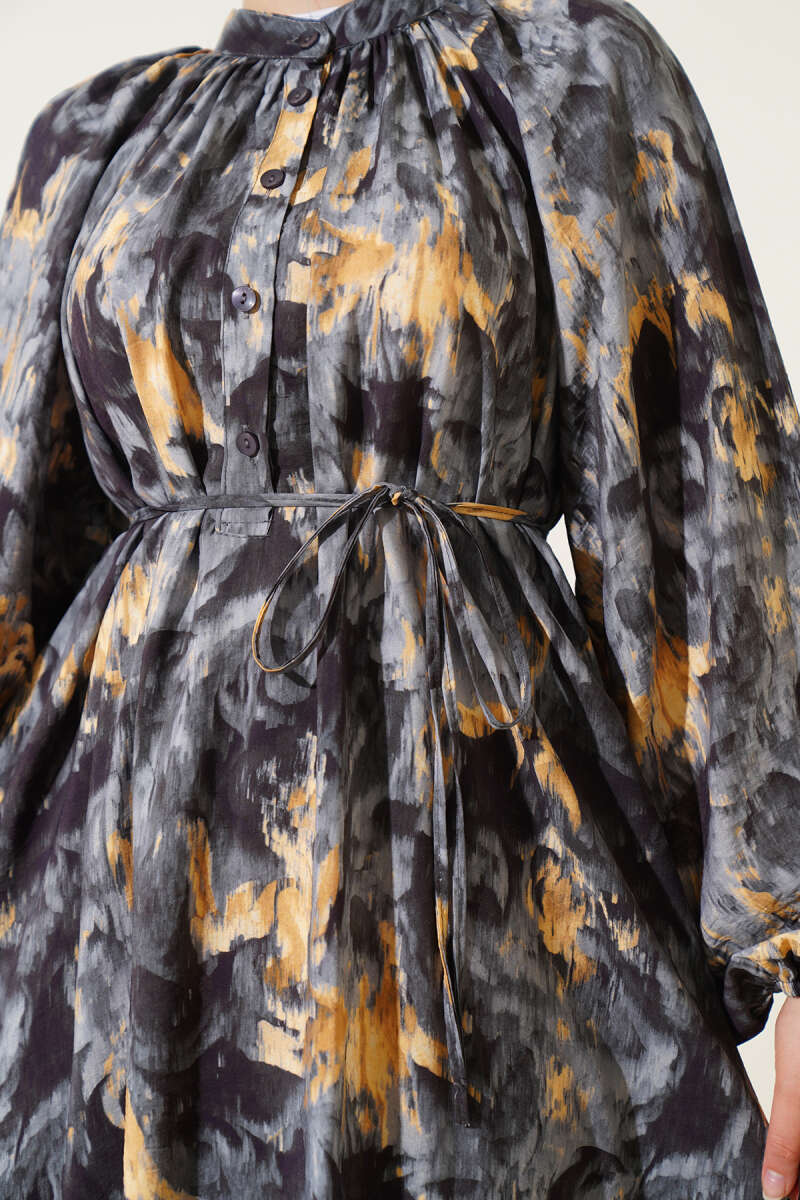 Ekose Desenli Kemerli Jile Elbise Siyah