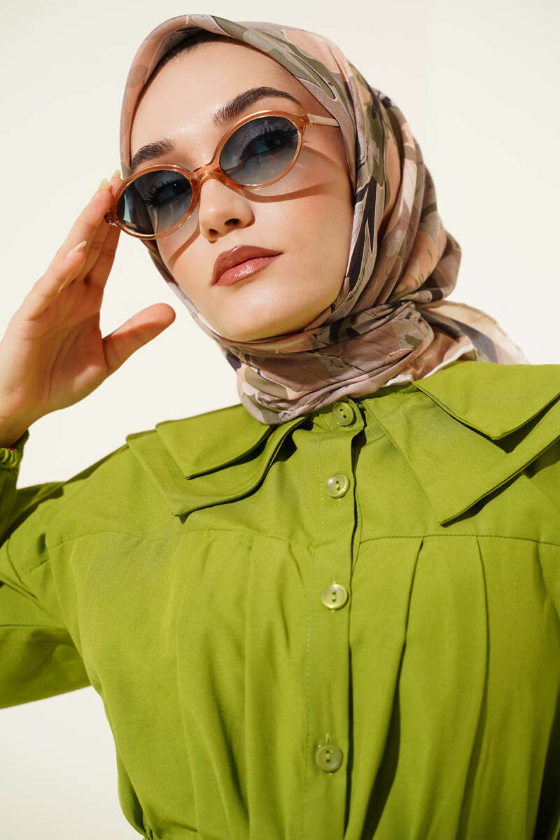Desenli Önü Düğmeli Elbise Zümrüt